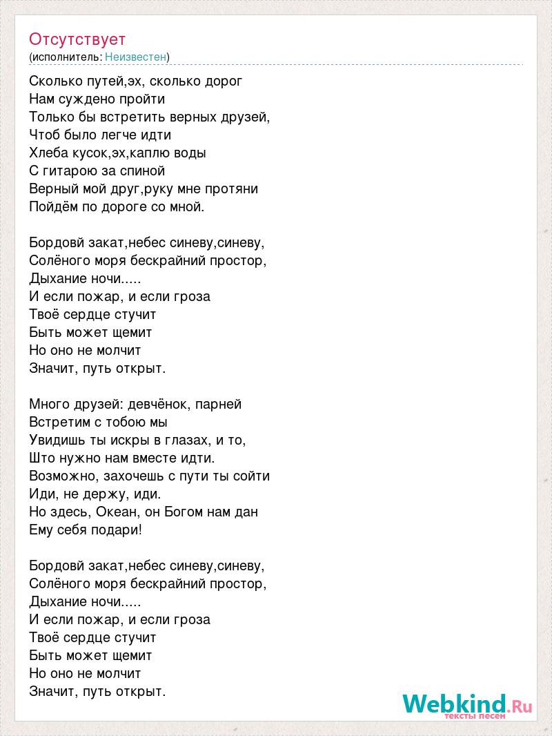 Сколько путей,эх, сколько дорог Нам суждено пройти Только бы встретить верных друзей, Чтоб было легче идти Хлеба кусок,эх,каплю воды С гитарою за спиной Верный мой друг,руку мне протяни Пойдём по дороге со мной. Бордовй закат,небес синеву,синеву, Солёного моря бескрайний простор, Дыхание ночи..... И если пожар, и если гроза Твоё сердце стучит Быть может щемит Но оно не молчит Значит, путь открыт. Много друзей: девчёнок, парней Встретим с тобою мы Увидишь ты искры в глазах, и то, Што нужно нам вместе идти. Возможно, захочешь с пути ты сойти Иди, не держу, иди. Но здесь, Океан, он Богом нам дан Ему себя подари! Бордовй закат,небес синеву,синеву, Солёного моря бескрайний простор, Дыхание ночи..... И если пожар, и если гроза Твоё сердце стучит Быть может щемит Но оно не молчит Значит, путь открыт.