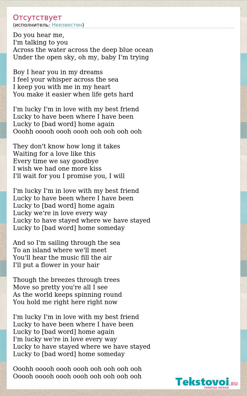 Do you hear me, I'm talking to you Across the water across the deep blue ocean Under the open sky, oh my, baby I'm trying Boy I hear you in my dreams I feel your whisper across the sea I keep you with me in my heart You make it easier when life gets hard I'm lucky I'm in love with my best friend Lucky to have been where I have been Lucky to [bad word] home again Ooohh ooooh oooh oooh ooh ooh ooh ooh They don't know how long it takes Waiting for a love like this Every time we say goodbye I wish we had one more kiss I'll wait for you I promise you, I will I'm lucky I'm in love with my best friend Lucky to have been where I have been Lucky to [bad word] home again Lucky we're in love every way Lucky to have stayed where we have stayed Lucky to [bad word] home someday And so I'm sailing through the sea To an island where we'll meet You'll hear the music fill the air I'll put a flower in your hair Though the breezes through trees Move so pretty you're all I see As the world keeps spinning round You hold me right here right now I'm lucky I'm in love with my best friend Lucky to have been where I have been Lucky to [bad word] home again I'm lucky we're in love every way Lucky to have stayed where we have stayed Lucky to [bad word] home someday Ooohh ooooh oooh oooh ooh ooh ooh ooh Ooooh ooooh oooh oooh ooh ooh ooh ooh