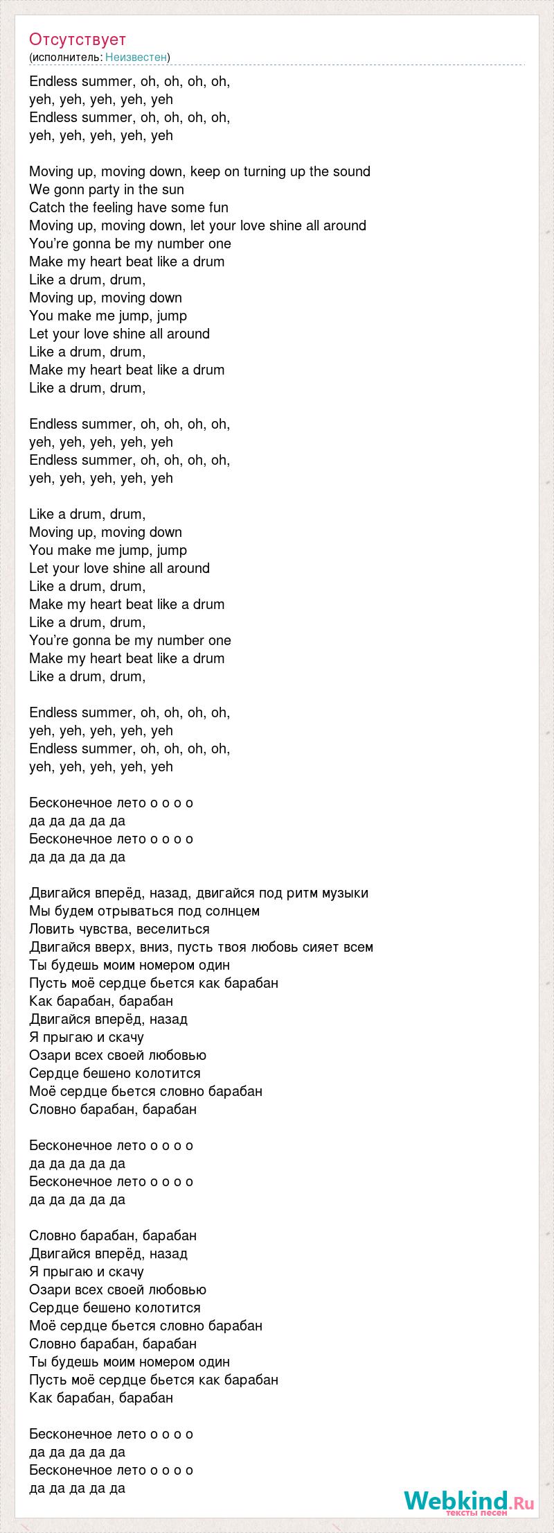 Endless summer, oh, oh, oh, oh, yeh, yeh, yeh, yeh, yeh Endless summer, oh, oh, oh, oh, yeh, yeh, yeh, yeh, yeh Moving up, moving down, keep on turning up the sound We gonn party in the sun Catch the feeling have some fun Moving up, moving down, let your love shine all around You’re gonna be my number one Make my heart beat like a [bad word] Like a [bad word] [bad word] Moving up, moving down You make me jump, jump Let your love shine all around Like a [bad word] [bad word] Make my heart beat like a [bad word] Like a [bad word] [bad word] Endless summer, oh, oh, oh, oh, yeh, yeh, yeh, yeh, yeh Endless summer, oh, oh, oh, oh, yeh, yeh, yeh, yeh, yeh Like a [bad word] [bad word] Moving up, moving down You make me jump, jump Let your love shine all around Like a [bad word] [bad word] Make my heart beat like a [bad word] Like a [bad word] [bad word] You’re gonna be my number one Make my heart beat like a [bad word] Like a [bad word] [bad word] Endless summer, oh, oh, oh, oh, yeh, yeh, yeh, yeh, yeh Endless summer, oh, oh, oh, oh, yeh, yeh, yeh, yeh, yeh Бесконечное лето о о о о да да да да да Бесконечное лето о о о о да да да да да Двигайся вперёд, назад, двигайся под ритм музыки Мы будем отрываться под солнцем Ловить чувства, веселиться Двигайся вверх, вниз, пусть твоя любовь сияет всем Ты будешь моим номером один Пусть моё сердце бьется как барабан Как барабан, барабан Двигайся вперёд, назад Я прыгаю и скачу Озари всех своей любовью Сердце бешено колотится Моё сердце бьется словно барабан Словно барабан, барабан Бесконечное лето о о о о да да да да да Бесконечное лето о о о о да да да да да Словно барабан, барабан Двигайся вперёд, назад Я прыгаю и скачу Озари всех своей любовью Сердце бешено колотится Моё сердце бьется словно барабан Словно барабан, барабан Ты будешь моим номером один Пусть моё сердце бьется как барабан Как барабан, барабан Бесконечное лето о о о о да да да да да Бесконечное лето о о о о да да да да да