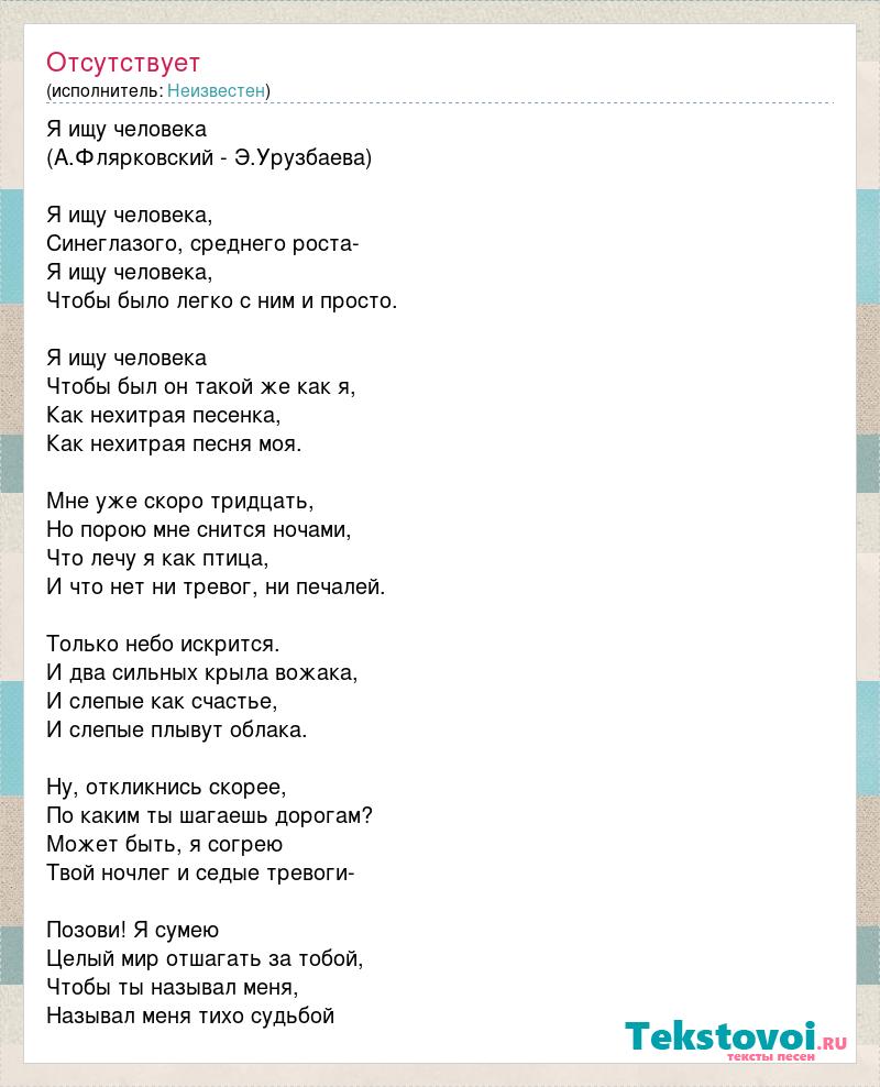 Я ищу человека (А.Флярковский - Э.Урузбаева) Я ищу человека, Синеглазого, среднего роста- Я ищу человека, Чтобы было легко с ним и просто. Я ищу человека Чтобы был он такой же как я, Как нехитрая песенка, Как нехитрая песня моя. Мне уже скоро тридцать, Но порою мне снится ночами, Что лечу я как птица, И что нет ни тревог, ни печалей. Только небо искрится. И два сильных крыла вожака, И слепые как счастье, И слепые плывут облака. Ну, откликнись скорее, По каким ты шагаешь дорогам? Может быть, я согрею Твой ночлег и седые тревоги- Позови! Я сумею Целый мир отшагать за тобой, Чтобы ты называл меня, Называл меня тихо судьбой