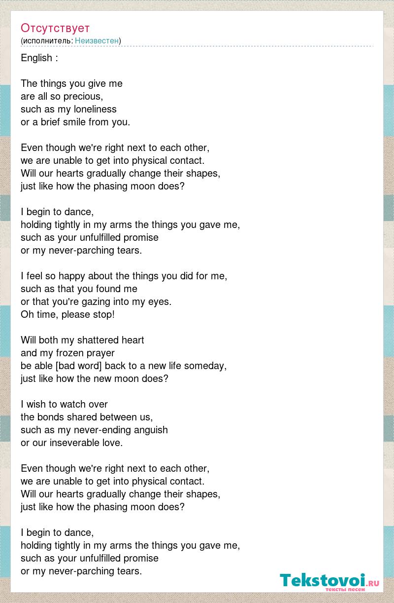 English : The things you give me are all so precious, such as my loneliness or a brief smile from you. Even though we're right next to each other, we are unable to get into physical contact. Will our hearts gradually change their shapes, just like how the phasing moon does? I begin to dance, holding tightly in my arms the things you gave me, such as your unfulfilled promise or my never-parching tears. I feel so happy about the things you did for me, such as that you found me or that you're gazing into my eyes. Oh time, please stop! Will both my shattered heart and my frozen prayer be able [bad word] back to a new life someday, just like how the new moon does? I wish to watch over the bonds shared between us, such as my never-ending anguish or our inseverable love. Even though we're right next to each other, we are unable to get into physical contact. Will our hearts gradually change their shapes, just like how the phasing moon does? I begin to dance, holding tightly in my arms the things you gave me, such as your unfulfilled promise or my never-parching tears.