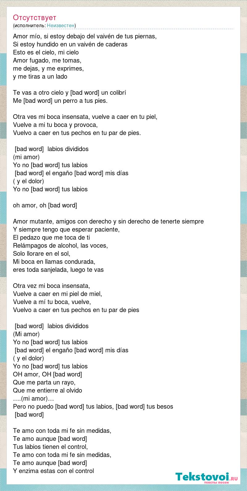 Amor mío, si estoy debajo del vaivén de tus piernas, Si estoy hundido en un vaivén de caderas Esto es el cielo, mi cielo Amor fugado, me tomas, me dejas, y me exprimes, y me tiras a un lado Te vas a otro cielo y [bad word] un colibrí Me [bad word] un perro a tus pies. Otra ves mi boca insensata, vuelve a caer en tu piel, Vuelve a mi tu boca y provoca, Vuelvo a caer en tus pechos en tu par de pies. [bad word] labios divididos (mi amor) Yo no [bad word] tus labios [bad word] el engaño [bad word] mis días ( y el dolor) Yo no [bad word] tus labios oh amor, oh [bad word] Amor mutante, amigos con derecho y sin derecho de tenerte siempre Y siempre tengo que esperar paciente, El pedazo que me toca de ti Relámpagos de alcohol, las voces, Solo llorare en el sol, Mi boca en llamas condurada, eres toda sanjelada, luego te vas Otra vez mi boca insensata, Vuelve a caer en mi piel de miel, Vuelve a mí tu boca, vuelve, Vuelvo a caer en tus pechos en tu par de pies [bad word] labios divididos (Mi amor) Yo no [bad word] tus labios [bad word] el engaño [bad word] mis días ( y el dolor) Yo no [bad word] tus labios OH amor, OH [bad word] Que me parta un rayo, Que me entierre al olvido ….(mi amor)… Pero no puedo [bad word] tus labios, [bad word] tus besos [bad word] Te amo con toda mi fe sin medidas, Te amo aunque [bad word] Tus labios tienen el control, Te amo con toda mi fe sin medidas, Te amo aunque [bad word] Y enzima estas con el control