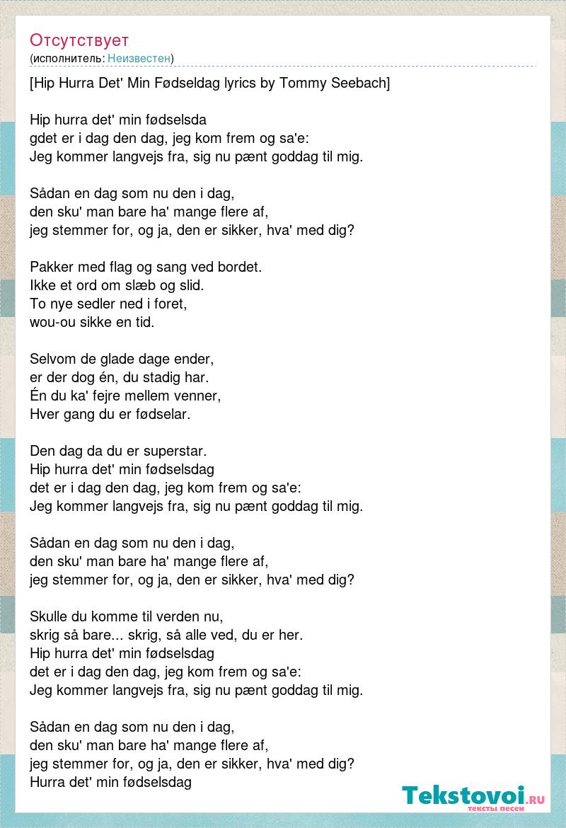 [Hip Hurra Det' Min Fødseldag lyrics by Tommy Seebach] Hip hurra det' min fødselsda gdet er i dag den dag, jeg kom frem og sa'e: Jeg kommer langvejs fra, sig nu pænt goddag til mig. Sådan en dag som nu den i dag, den sku' man bare ha' mange flere af, jeg stemmer for, og ja, den er sikker, hva' med dig? Pakker med flag og sang ved bordet. Ikke et ord om slæb og slid. To nye sedler ned i foret, wou-ou sikke en tid. Selvom de glade dage ender, er der dog én, du stadig har. Én du ka' fejre mellem venner, Hver gang du er fødselar. Den dag da du er superstar. Hip hurra det' min fødselsdag det er i dag den dag, jeg kom frem og sa'e: Jeg kommer langvejs fra, sig nu pænt goddag til mig. Sådan en dag som nu den i dag, den sku' man bare ha' mange flere af, jeg stemmer for, og ja, den er sikker, hva' med dig? Skulle du komme til verden nu, skrig så bare... skrig, så alle ved, du er her. Hip hurra det' min fødselsdag det er i dag den dag, jeg kom frem og sa'e: Jeg kommer langvejs fra, sig nu pænt goddag til mig. Sådan en dag som nu den i dag, den sku' man bare ha' mange flere af, jeg stemmer for, og ja, den er sikker, hva' med dig? Hurra det' min fødselsdag