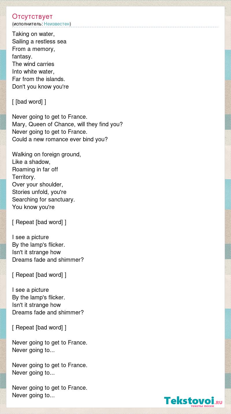 Taking on water, Sailing a restless sea From a memory, fantasy. The wind carries Into white water, Far from the islands. Don't you know you're [ [bad word] ] Never going to get to France. Mary, Queen of Chance, will they find you? Never going to get to France. Could a new romance ever bind you? Walking on foreign ground, Like a shadow, Roaming in far off Territory. Over your shoulder, Stories unfold, you're Searching for sanctuary. You know you're [ Repeat [bad word] ] I see a picture By the lamp's flicker. Isn't it strange how Dreams fade and shimmer? [ Repeat [bad word] ] I see a picture By the lamp's flicker. Isn't it strange how Dreams fade and shimmer? [ Repeat [bad word] ] Never going to get to France. Never going to... Never going to get to France. Never going to... Never going to get to France. Never going to...