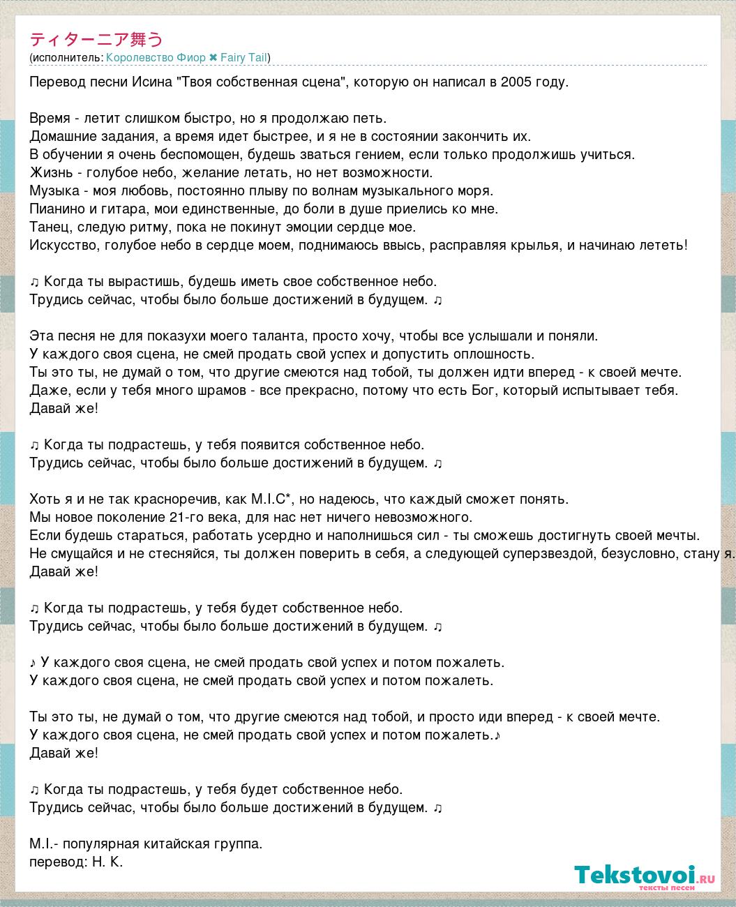 Перевод песни Исина "Твоя собственная сцена", которую он написал в 2005 году. Время - летит слишком быстро, но я продолжаю петь. Домашние задания, а время идет быстрее, и я не в состоянии закончить их. В обучении я очень беспомощен, будешь зваться гением, если только продолжишь учиться. Жизнь - голубое небо, желание летать, но нет возможности. Музыка - моя любовь, постоянно плыву по волнам музыкального моря. Пианино и гитара, мои единственные, до боли в душе приелись ко мне. Танец, следую ритму, пока не покинут эмоции сердце мое. Искусство, голубое небо в сердце моем, поднимаюсь ввысь, расправляя крылья, и начинаю лететь! ♫ Когда ты вырастишь, будешь иметь свое собственное небо. Трудись сейчас, чтобы было больше достижений в будущем. ♫ Эта песня не для показухи моего таланта, просто хочу, чтобы все услышали и поняли. У каждого своя сцена, не смей продать свой успех и допустить оплошность. Ты это ты, не думай о том, что другие смеются над тобой, ты должен идти вперед - к своей мечте. Даже, если у тебя много шрамов - все прекрасно, потому что есть Бог, который испытывает тебя. Давай же! ♫ Когда ты подрастешь, у тебя появится собственное небо. Трудись сейчас, чтобы было больше достижений в будущем. ♫ Хоть я и не так красноречив, как M.I.C*, но надеюсь, что каждый сможет понять. Мы новое поколение 21-го века, для нас нет ничего невозможного. Если будешь стараться, работать усердно и наполнишься сил - ты сможешь достигнуть своей мечты. Не смущайся и не стесняйся, ты должен поверить в себя, а следующей суперзвездой, безусловно, стану я. Давай же! ♫ Когда ты подрастешь, у тебя будет собственное небо. Трудись сейчас, чтобы было больше достижений в будущем. ♫ ♪ У каждого своя сцена, не смей продать свой успех и потом пожалеть. У каждого своя сцена, не смей продать свой успех и потом пожалеть. Ты это ты, не думай о том, что другие смеются над тобой, и просто иди вперед - к своей мечте. У каждого своя сцена, не смей продать свой успех и потом пожалеть.♪ Давай же! ♫ Когда ты подрастешь, у тебя будет собственное небо. Трудись сейчас, чтобы было больше достижений в будущем. ♫ M.I.- популярная китайская группа. перевод: Н. К.