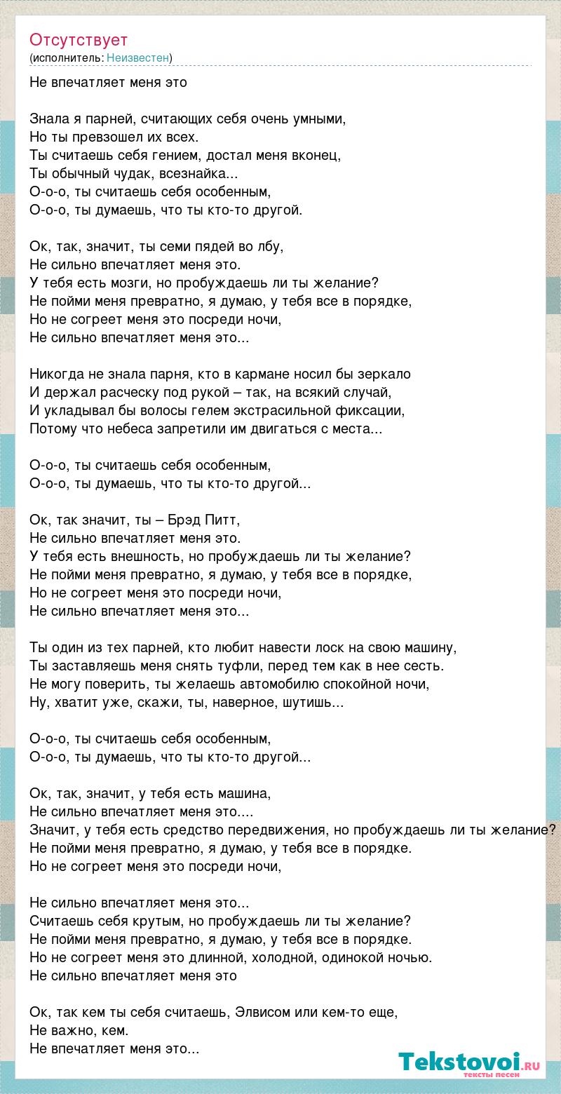 Не впечатляет меня это Знала я парней, считающих себя очень умными, Но ты превзошел их всех. Ты считаешь себя гением, достал меня вконец, Ты обычный чудак, всезнайка... О-о-о, ты считаешь себя особенным, О-о-о, ты думаешь, что ты кто-то другой. Ок, так, значит, ты семи пядей во лбу, Не сильно впечатляет меня это. У тебя есть мозги, но пробуждаешь ли ты желание? Не пойми меня превратно, я думаю, у тебя все в порядке, Но не согреет меня это посреди ночи, Не сильно впечатляет меня это... Никогда не знала парня, кто в кармане носил бы зеркало И держал расческу под рукой – так, на всякий случай, И укладывал бы волосы гелем экстрасильной фиксации, Потому что небеса запретили им двигаться с места... О-о-о, ты считаешь себя особенным, О-о-о, ты думаешь, что ты кто-то другой... Ок, так значит, ты – Брэд Питт, Не сильно впечатляет меня это. У тебя есть внешность, но пробуждаешь ли ты желание? Не пойми меня превратно, я думаю, у тебя все в порядке, Но не согреет меня это посреди ночи, Не сильно впечатляет меня это... Ты один из тех парней, кто любит навести лоск на свою машину, Ты заставляешь меня снять туфли, перед тем как в нее сесть. Не могу поверить, ты желаешь автомобилю спокойной ночи, Ну, хватит уже, скажи, ты, наверное, шутишь... О-о-о, ты считаешь себя особенным, О-о-о, ты думаешь, что ты кто-то другой... Ок, так, значит, у тебя есть машина, Не сильно впечатляет меня это.... Значит, у тебя есть средство передвижения, но пробуждаешь ли ты желание? Не пойми меня превратно, я думаю, у тебя все в порядке. Но не согреет меня это посреди ночи, Не сильно впечатляет меня это... Считаешь себя крутым, но пробуждаешь ли ты желание? Не пойми меня превратно, я думаю, у тебя все в порядке. Но не согреет меня это длинной, холодной, одинокой ночью. Не сильно впечатляет меня это Ок, так кем ты себя считаешь, Элвисом или кем-то еще, Не важно, кем. Не впечатляет меня это...