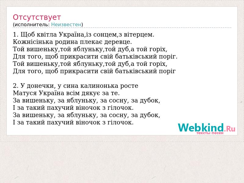1. Щоб квітла Україна,із сонцем,з вітерцем. Кожнісінька родина плекає деревце. Той вишеньку,той яблуньку,той дуб,а той горіх, Для того, щоб прикрасити свій батьківський поріг. Той вишеньку,той яблуньку,той дуб,а той горіх, Для того, щоб прикрасити свій батьківський поріг 2. У донечки, у сина калинонька росте Матуся Україна всім дякує за те. За вишеньку, за яблуньку, за сосну, за дубок, І за такий пахучий віночок з гілочок. За вишеньку, за яблуньку, за сосну, за дубок, І за такий пахучий віночок з гілочок.