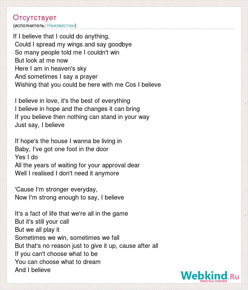 If I believe that I could do anything, Could I spread my wings and say goodbye So many people told me I couldn't win But look at me now Here I am in heaven's sky And sometimes I say a prayer Wishing that you could be here with me Cos I believe I believe in love, it's the best of everything I believe in hope and the changes it can bring If you believe then nothing can stand in your way Just say, I believe If hope's the house I wanna be living in Baby, I've got one foot in the door Yes I do All the years of waiting for your approval dear Well I realised I don't need it anymore 'Cause I'm stronger everyday, Now I'm strong enough to say, I believe It's a fact of life that we're all in the game But it's still your call But we all play it Sometimes we win, sometimes we fall But that's no reason just to give it up, cause after all If you can't choose what to be You can choose what to dream And I believe