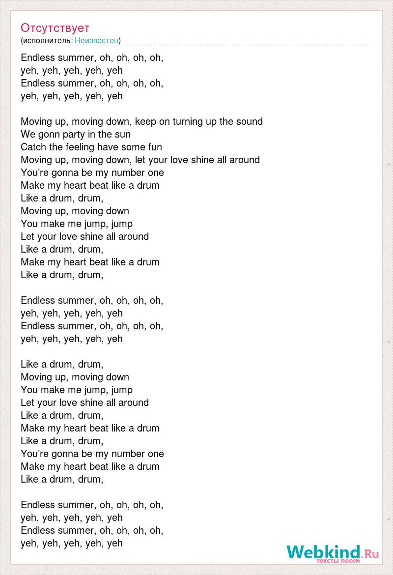 Endless summer, oh, oh, oh, oh, yeh, yeh, yeh, yeh, yeh Endless summer, oh, oh, oh, oh, yeh, yeh, yeh, yeh, yeh Moving up, moving down, keep on turning up the sound We gonn party in the sun Catch the feeling have some fun Moving up, moving down, let your love shine all around You’re gonna be my number one Make my heart beat like a [bad word] Like a [bad word] [bad word] Moving up, moving down You make me jump, jump Let your love shine all around Like a [bad word] [bad word] Make my heart beat like a [bad word] Like a [bad word] [bad word] Endless summer, oh, oh, oh, oh, yeh, yeh, yeh, yeh, yeh Endless summer, oh, oh, oh, oh, yeh, yeh, yeh, yeh, yeh Like a [bad word] [bad word] Moving up, moving down You make me jump, jump Let your love shine all around Like a [bad word] [bad word] Make my heart beat like a [bad word] Like a [bad word] [bad word] You’re gonna be my number one Make my heart beat like a [bad word] Like a [bad word] [bad word] Endless summer, oh, oh, oh, oh, yeh, yeh, yeh, yeh, yeh Endless summer, oh, oh, oh, oh, yeh, yeh, yeh, yeh, yeh