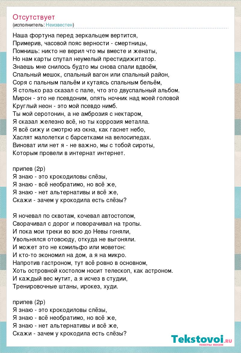 Наша фортуна перед зеркальцем вертится, Примерив, часовой пояс верности - смертницы, Помнишь: никто не верил что мы вместе и женаты, Но нам карты спутал неумелый престидижитатор. Знаешь мне снилось будто мы снова спали вдвоём, Спальный мешок, спальный вагон или спальный район, Соря с пальным пальём и кутаясь спальным бельём, Я столько раз сказал с пале, что это двуспальный альбом. Мирон - это не псевдоним, опять ночник над моей головой Круглый неон - это мой псевдо нимб. Ты мой серотонин, а не амброзия с нектаром, Я сказал железно всё, но ты коррозия металла. Я всё сижу и смотрю из окна, как гаснет небо, Хаслят малолетки с барсетками на велосипедах. Виноват или нет я - не важно, мы с тобой сироты, Которым провели в интернат интернет. припев (2р) Я знаю - это крокодиловы слёзы, Я знаю - всё необратимо, но всё же, Я знаю - нет альтернативы и всё же, Скажи - зачем у крокодила есть слёзы? Я ночевал по сквотам, кочевал автостопом, Сворачивал с дорог и поворачивал на тропы. И пока мои треки во всю до Невы гоняли, Увольнялся отовсюду, откуда не выгоняли. И может это не комильфо или моветон: И кто-то экономил на дом, а я на микро. Напротив гастроном, тут всё ровно в основном, Хоть островной костолом носит телескоп, как астроном. И каждый вес мутит, а я исчез в студии, Тренировочные штаны, ирокез, худи. припев (2р) Я знаю - это крокодиловы слёзы, Я знаю - всё необратимо, но всё же, Я знаю - нет альтернативы и всё же, Скажи - зачем у крокодила есть слёзы?
