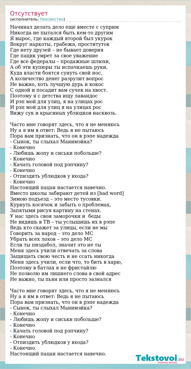 Начинал делать дело еще вместе с суприм Никогда не пытался быть кем-то другим Я вырос, где каждый второй был укурок Вокруг наркоты, грабежа, проституток Где нету друзей – не бывает доверия Где пацик умрет за свое уважение Где все федералы – продажные шлюхи, А об эти купюры ты испачкаешь руки, Куда власти боятся сунуть свой нос, А количество денег разрулит вопрос Не важно, хоть лучшую дурь и кокос С одной и посадит вам сучек на хвост. Поэтому я с детства ищу лавандос И рэп мой для улиц, я на улицах рос И рэп мой для улиц я на улицах рос Вижу сук и крысиных ублюдков насквозь. Часто мне говорят здесь, что я не меняюсь Ну а я им в ответ: Ведь я не пытаюсь Пора вам признать, что он в рэпе надежда - Сынок, ты слыхал Манимэйка? - Конечно - Любишь жопу и сиськи побольше? - Конечно - Качать головой под рэпчину? - Конечно - Отпиздить ублюдков у входа? - Конечно Настоящий пацан настается навечно. Вместо школы забирают детей из [bad word] Зимою подъезд – это место тусовки. Курнуть косячок и забыть о проблемах, Запятыми рисуя картину на стенах. У нас здесь свои заморочки и беды Не видишь в ТВ – ты услышишь их в рэпе Ведь кто скажет за улицы, если не мы Говорить за народ – это дело МС Убрать всех лохов – это дело МС Если ты пиздабол, значит это не ты Меня здесь учили отвечать за слова Защищать свою честь и не ссать никогда Меня здесь учили, если что, то бить в харю, Поэтому в батлах я не фристайлю Не позволю им лишнего слова в свой адрес Не важно, ты пьян или просто зазнался Часто мне говорят здесь, что я не меняюсь Ну а я им в ответ: Ведь я не пытаюсь Пора вам признать, что он в рэпе надежда - Сынок, ты слыхал Манимэйка? - Конечно - Любишь жопу и сиськи побольше? - Конечно - Качать головой под рэпчину? - Конечно - Отпиздить ублюдков у входа? - Конечно. Настоящий пацан настается навечно.