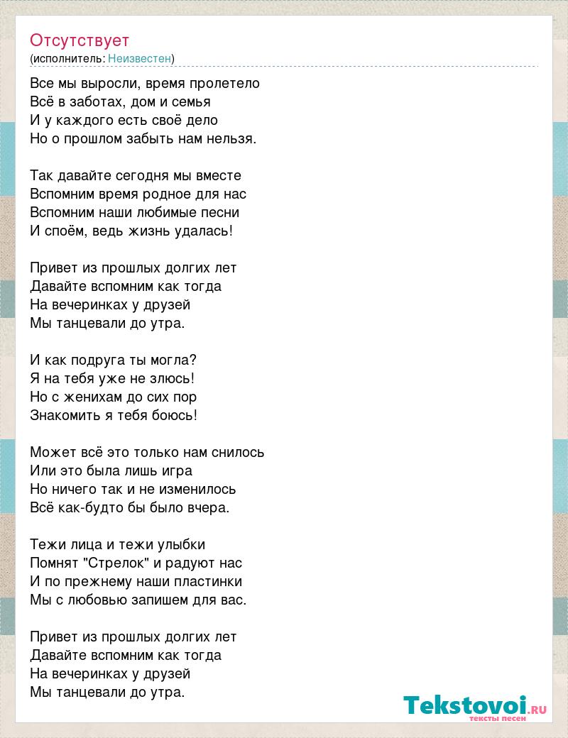 Все мы выросли, время пролетело Всё в заботах, дом и семья И у каждого есть своё дело Но о прошлом забыть нам нельзя. Так давайте сегодня мы вместе Вспомним время родное для нас Вспомним наши любимые песни И споём, ведь жизнь удалась! Привет из прошлых долгих лет Давайте вспомним как тогда На вечеринках у друзей Мы танцевали до утра. И как подруга ты могла? Я на тебя уже не злюсь! Но с женихам до сих пор Знакомить я тебя боюсь! Может всё это только нам снилось Или это была лишь игра Но ничего так и не изменилось Всё как-будто бы было вчера. Тежи лица и тежи улыбки Помнят "Стрелок" и радуют нас И по прежнему наши пластинки Мы с любовью запишем для вас. Привет из прошлых долгих лет Давайте вспомним как тогда На вечеринках у друзей Мы танцевали до утра.