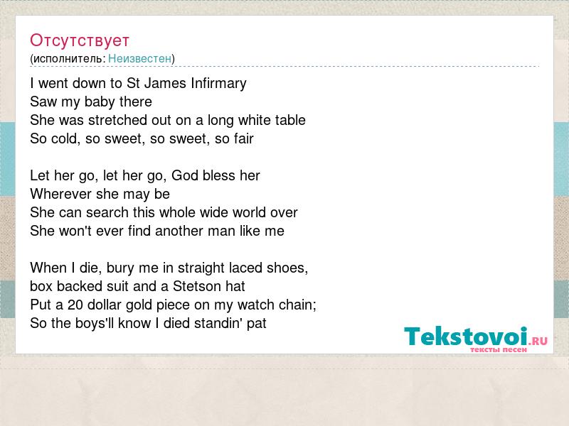 I went down to St James Infirmary Saw my baby there She was stretched out on a long white table So cold, so sweet, so sweet, so fair Let her go, let her go, God bless her Wherever she may be She can search this whole wide world over She won't ever find another man like me When I die, bury me in straight laced shoes, box backed suit and a Stetson hat Put a 20 dollar gold piece on my watch chain; So the boys'll know I died standin' pat