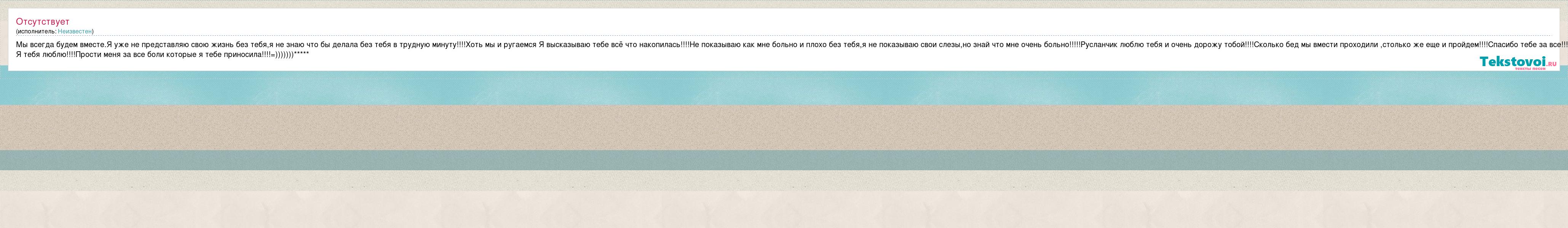 Мы всегда будем вместе.Я уже не представляю свою жизнь без тебя,я не знаю что бы делала без тебя в трудную минуту!!!!Хоть мы и ругаемся Я высказываю тебе всё что накопилась!!!!Не показываю как мне больно и плохо без тебя,я не показываю свои слезы,но знай что мне очень больно!!!!!Русланчик люблю тебя и очень дорожу тобой!!!!Сколько бед мы вмести проходили ,столько же еще и пройдем!!!!Спасибо тебе за все!!! Я тебя люблю!!!!Прости меня за все боли которые я тебе приносила!!!!=)))))))*****