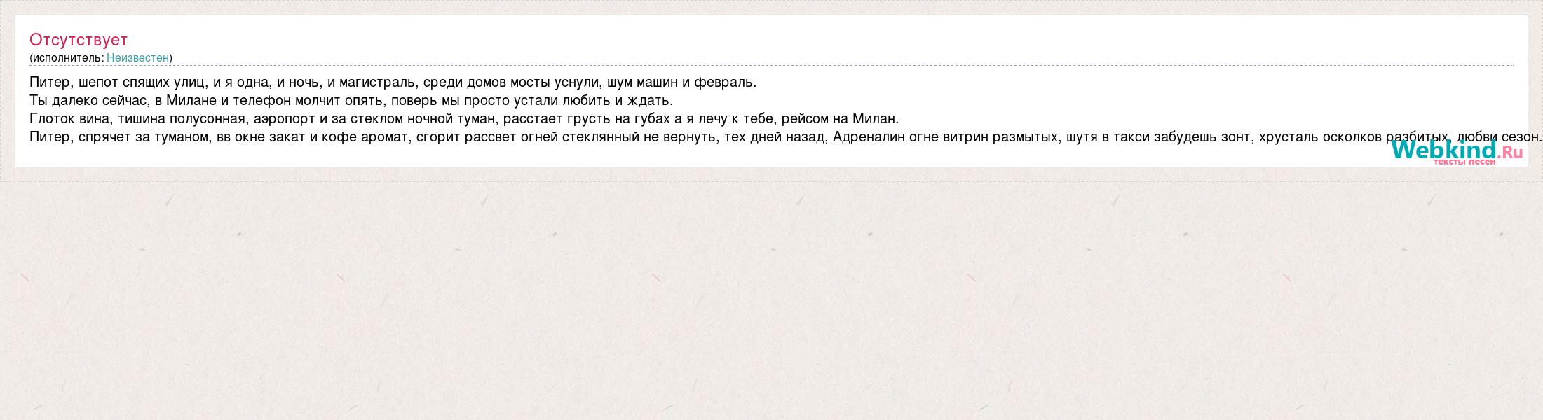 Питер, шепот спящих улиц, и я одна, и ночь, и магистраль, среди домов мосты уснули, шум машин и февраль. Ты далеко сейчас, в Милане и телефон молчит опять, поверь мы просто устали любить и ждать. Глоток вина, тишина полусонная, аэропорт и за стеклом ночной туман, расстает грусть на губах а я лечу к тебе, рейсом на Милан. Питер, спрячет за туманом, вв окне закат и кофе аромат, сгорит рассвет огней стеклянный не вернуть, тех дней назад, Адреналин огне витрин размытых, шутя в такси забудешь зонт, хрусталь осколков разбитых, любви сезон.
