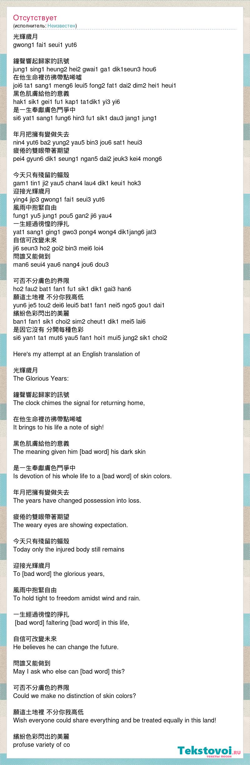 光輝歲月 gwong1 fai1 seui1 yut6 鐘聲響起歸家的訊號 jung1 sing1 heung2 hei2 gwai1 ga1 dik1seun3 hou6 在他生命裡彷彿帶點唏噓 joi6 ta1 sang1 meng6 leui5 fong2 fat1 dai2 dim2 hei1 heui1 黑色肌膚給他的意義 hak1 sik1 gei1 fu1 kap1 ta1dik1 yi3 yi6 是一生奉獻膚色鬥爭中 si6 yat1 sang1 fung6 hin3 fu1 sik1 dau3 jang1 jung1 年月把擁有變做失去 nin4 yut6 ba2 yung2 yau5 bin3 jou6 sat1 heui3 疲倦的雙眼帶著期望 pei4 gyun6 dik1 seung1 ngan5 dai2 jeuk3 kei4 mong6 今天只有殘留的軀殼 gam1 tin1 ji2 yau5 chan4 lau4 dik1 keui1 hok3 迎接光輝歲月 ying4 jip3 gwong1 fai1 seui3 yut6 風雨中抱緊自由 fung1 yu5 jung1 pou5 gan2 ji6 yau4 一生經過徬惶的掙扎 yat1 sang1 ging1 gwo3 pong4 wong4 dik1jang6 jat3 自信可改變未來 ji6 seun3 ho2 goi2 bin3 mei6 loi4 問誰又能做到 man6 seui4 yau6 nang4 jou6 dou3 可否不分膚色的界限 ho2 fau2 bat1 fan1 fu1 sik1 dik1 gai3 han6 願這土地裡 不分你我高低 yun6 je5 tou2 dei6 leui5 bat1 fan1 nei5 ngo5 gou1 dai1 繽紛色彩閃出的美麗 ban1 fan1 sik1 choi2 sim2 cheut1 dik1 mei5 lai6 是因它沒有 分開每種色彩 si6 yan1 ta1 mut6 yau5 fan1 hoi1 mui5 jung2 sik1 choi2 Here's my attempt at an English translation of 光輝歲月 The Glorious Years: 鐘聲響起歸家的訊號 The clock chimes the signal for returning home, 在他生命裡彷彿帶點唏噓 It brings to his life a note of sigh! 黑色肌膚給他的意義 The meaning given him [bad word] his dark skin 是一生奉獻膚色鬥爭中 Is devotion of his whole life to a [bad word] of skin colors. 年月把擁有變做失去 The years have changed possession into loss. 疲倦的雙眼帶著期望 The weary eyes are showing expectation. 今天只有殘留的軀殼 Today only the injured body still remains 迎接光輝歲月 To [bad word] the glorious years, 風雨中抱緊自由 To hold tight to freedom amidst wind and rain. 一生經過徬惶的掙扎 [bad word] faltering [bad word] in this life, 自信可改變未來 He believes he can change the future. 問誰又能做到 May I ask who else can [bad word] this? 可否不分膚色的界限 Could we make no distinction of skin colors? 願這土地裡 不分你我高低 Wish everyone could share everything and be treated equally in this land! 繽紛色彩閃出的美麗 profuse variety of co