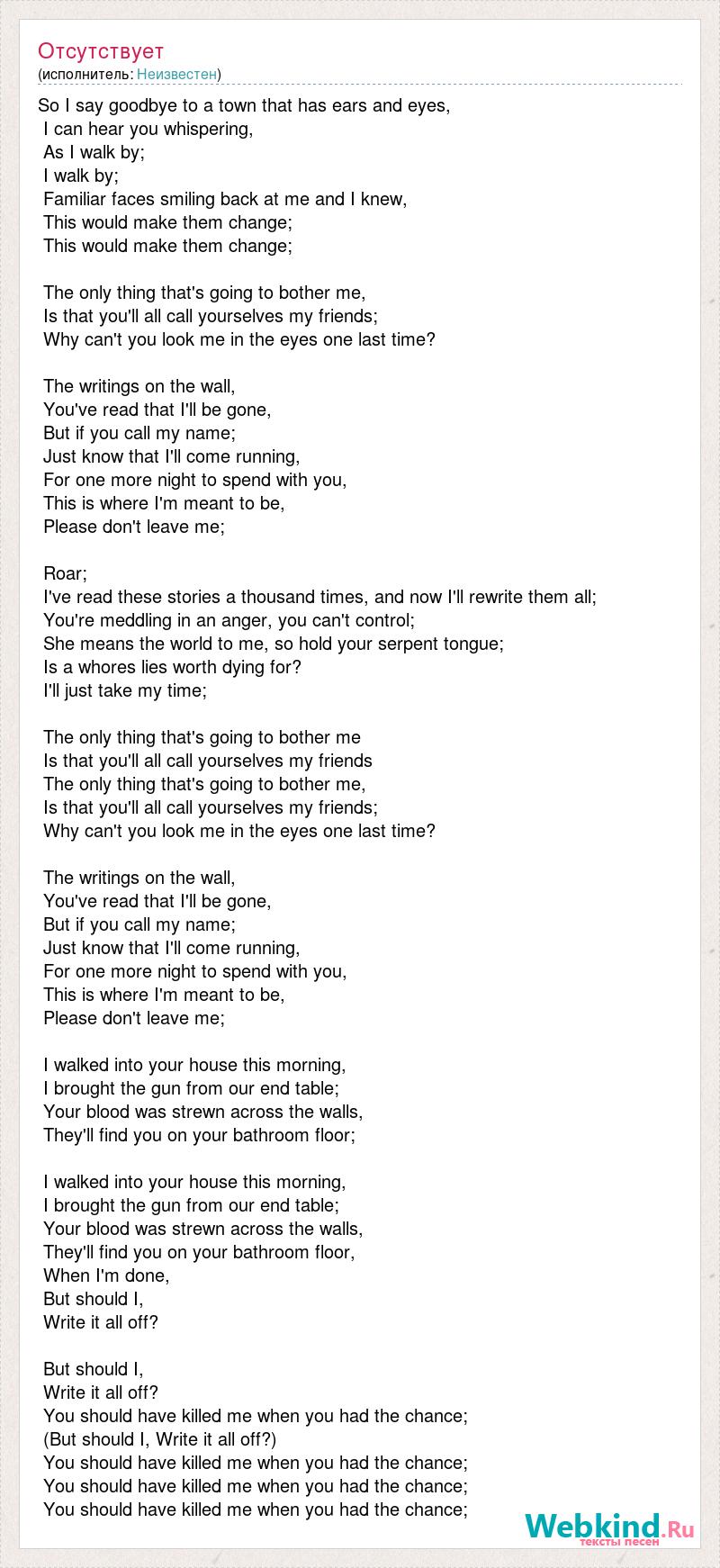 So I say goodbye to a town that has ears and eyes, I can hear you whispering, As I walk by; I walk by; Familiar faces smiling back at me and I knew, This would make them change; This would make them change; The only thing that's going to bother me, Is that you'll all call yourselves my friends; Why can't you look me in the eyes one last time? The writings on the wall, You've read that I'll be gone, But if you call my name; Just know that I'll [bad word] For one more night to spend with you, This is where I'm meant to be, Please don't leave me; Roar; I've read these stories a thousand times, and now I'll rewrite them all; You're meddling in an anger, you can't control; She means the world to me, so hold your serpent tongue; Is a whores lies worth dying for? I'll just take my time; The only thing that's going to bother me Is that you'll all call yourselves my friends The only thing that's going to bother me, Is that you'll all call yourselves my friends; Why can't you look me in the eyes one last time? The writings on the wall, You've read that I'll be gone, But if you call my name; Just know that I'll [bad word] For one more night to spend with you, This is where I'm meant to be, Please don't leave me; I walked into your house this morning, I brought the gun from our end table; Your blood was strewn across the walls, They'll find you on your bathroom floor; I walked into your house this morning, I brought the gun from our end table; Your blood was strewn across the walls, They'll find you on your bathroom floor, When I'm done, But should I, Write it all off? But should I, Write it all off? You should have killed me when you had the chance; (But should I, Write it all off?) You should have killed me when you had the chance; You should have killed me when you had the chance; You should have killed me when you had the chance;