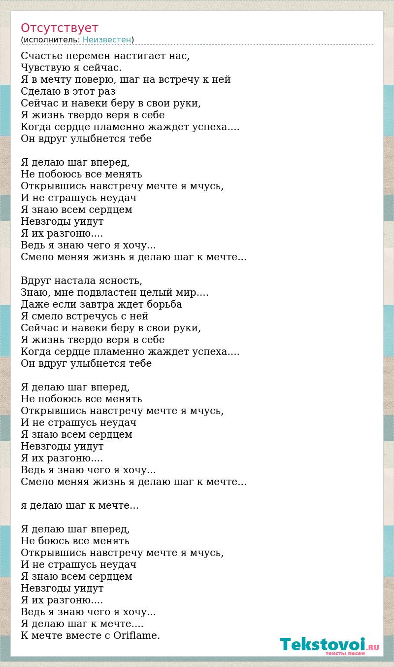 Счастье перемен настигает нас, Чувствую я сейчас. Я в мечту поверю, шаг на встречу к ней Сделаю в этот раз Сейчас и навеки беру в свои руки, Я жизнь твердо веря в себе Когда сердце пламенно жаждет успеха.... Он вдруг улыбнется тебе Я делаю шаг вперед, Не побоюсь все менять Открывшись навстречу мечте я мчусь, И не страшусь неудач Я знаю всем сердцем Невзгоды уидут Я их разгоню.... Ведь я знаю чего я хочу... Смело меняя жизнь я делаю шаг к мечте... Вдруг настала ясность, Знаю, мне подвластен целый мир.... Даже если завтра ждет борьба Я смело встречусь с ней Сейчас и навеки беру в свои руки, Я жизнь твердо веря в себе Когда сердце пламенно жаждет успеха.... Он вдруг улыбнется тебе Я делаю шаг вперед, Не побоюсь все менять Открывшись навстречу мечте я мчусь, И не страшусь неудач Я знаю всем сердцем Невзгоды уидут Я их разгоню.... Ведь я знаю чего я хочу... Смело меняя жизнь я делаю шаг к мечте... я делаю шаг к мечте... Я делаю шаг вперед, Не боюсь все менять Открывшись навстречу мечте я мчусь, И не страшусь неудач Я знаю всем сердцем Невзгоды уидут Я их разгоню.... Ведь я знаю чего я хочу... Я делаю шаг к мечте.... К мечте вместе с Oriflame.