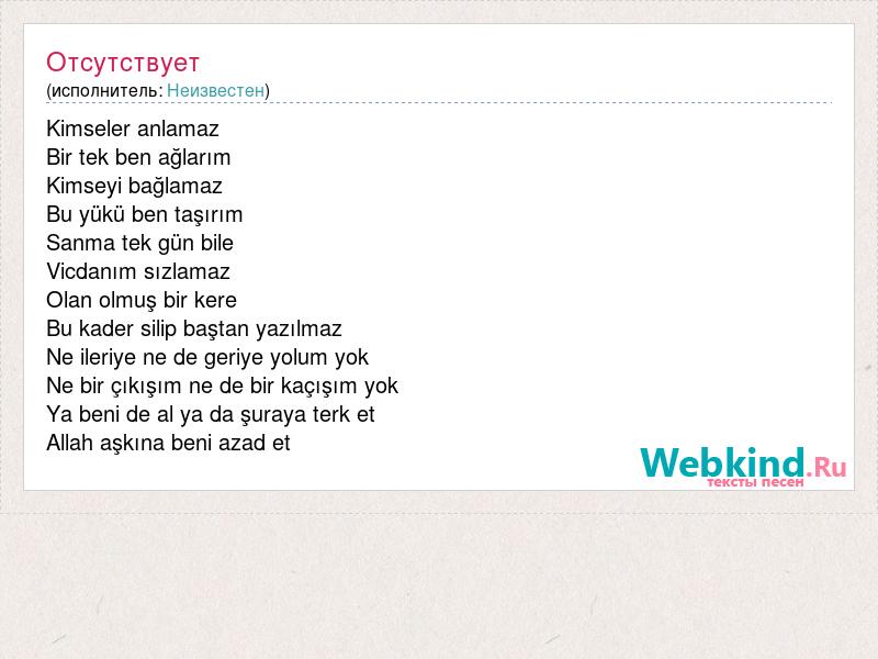 Kimseler anlamaz Bir tek ben ağlarım Kimseyi bağlamaz Bu yükü ben taşırım Sanma tek gün bile Vicdanım sızlamaz Olan olmuş bir kere Bu kader silip baştan yazılmaz Ne ileriye ne de geriye yolum yok Ne bir çıkışım ne de bir kaçışım yok Ya beni de al ya da şuraya terk et Allah aşkına beni azad et