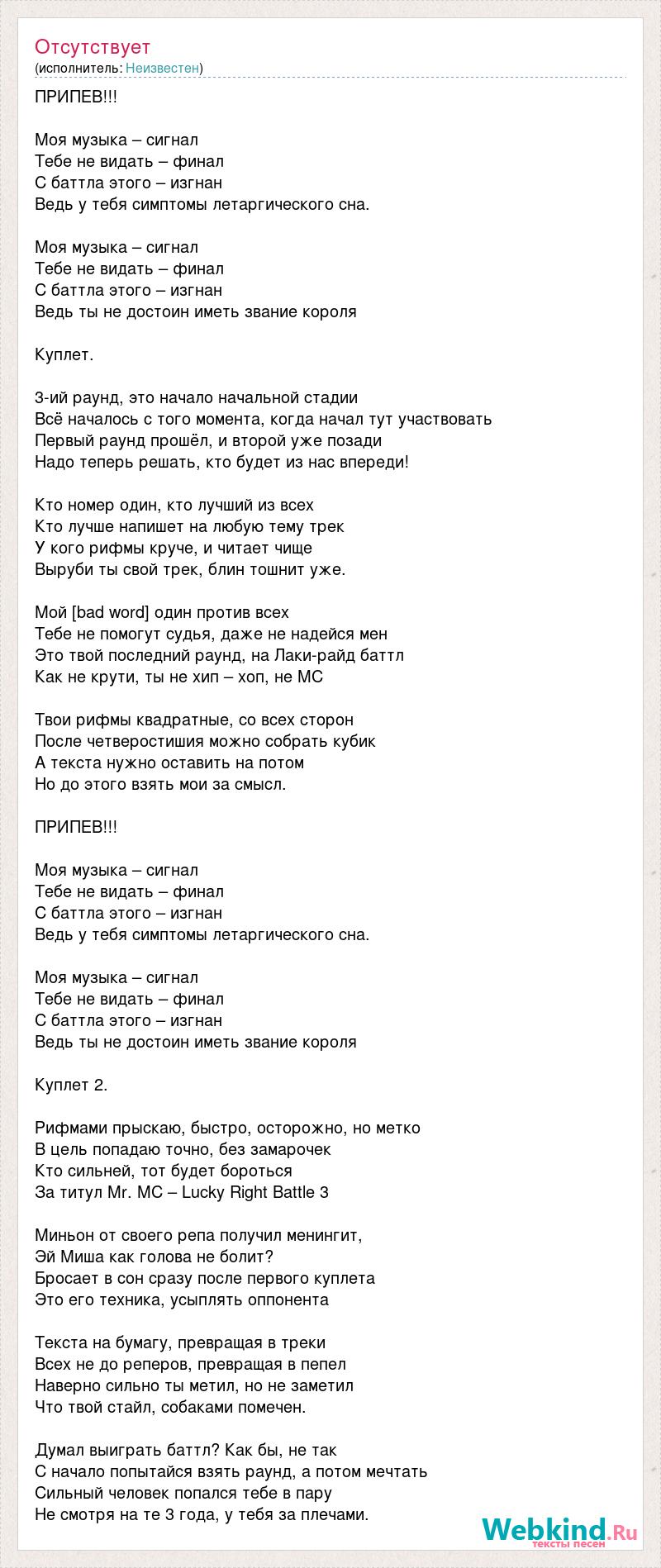 ПРИПЕВ!!! Моя музыка – сигнал Тебе не видать – финал С баттла этого – изгнан Ведь у тебя симптомы летаргического сна. Моя музыка – сигнал Тебе не видать – финал С баттла этого – изгнан Ведь ты не достоин иметь звание короля Куплет. 3-ий раунд, это начало начальной стадии Всё началось с того момента, когда начал тут участвовать Первый раунд прошёл, и второй уже позади Надо теперь решать, кто будет из нас впереди! Кто номер один, кто лучший из всех Кто лучше напишет на любую тему трек У кого рифмы круче, и читает чище Выруби ты свой трек, блин тошнит уже. Мой [bad word] один против всех Тебе не помогут судья, даже не надейся мен Это твой последний раунд, на Лаки-райд баттл Как не крути, ты не хип – хоп, не MC Твои рифмы квадратные, со всех сторон После четверостишия можно собрать кубик А текста нужно оставить на потом Но до этого взять мои за смысл. ПРИПЕВ!!! Моя музыка – сигнал Тебе не видать – финал С баттла этого – изгнан Ведь у тебя симптомы летаргического сна. Моя музыка – сигнал Тебе не видать – финал С баттла этого – изгнан Ведь ты не достоин иметь звание короля Куплет 2. Рифмами прыскаю, быстро, осторожно, но метко В цель попадаю точно, без замарочек Кто сильней, тот будет бороться За титул Mr. MC – Lucky Right Battle 3 Миньон от своего репа получил менингит, Эй Миша как голова не болит? Бросает в сон сразу после первого куплета Это его техника, усыплять оппонента Текста на бумагу, превращая в треки Всех не до реперов, превращая в пепел Наверно сильно ты метил, но не заметил Что твой стайл, собаками помечен. Думал выиграть баттл? Как бы, не так С начало попытайся взять раунд, а потом мечтать Сильный человек попался тебе в пару Не смотря на те 3 года, у тебя за плечами.