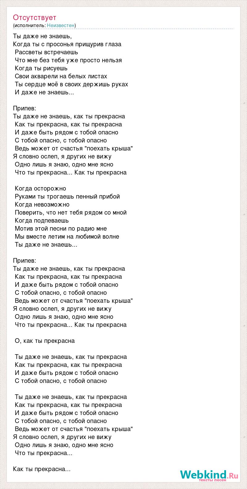 Ты даже не знаешь, Когда ты с просонья прищурив глаза Рассветы встречаешь Что мне без тебя уже просто нельзя Когда ты рисуешь Свои акварели на белых листах Ты сердце моё в своих держишь руках И даже не знаешь... Припев: Ты даже не знаешь, как ты прекрасна Как ты прекрасна, как ты прекрасна И даже быть рядом с тобой опасно С тобой опасно, с тобой опасно Ведь может от счастья "поехать крыша" Я словно ослеп, я других не вижу Одно лишь я знаю, одно мне ясно Что ты прекрасна... Как ты прекрасна Когда осторожно Руками ты трогаешь пенный прибой Когда невозможно Поверить, что нет тебя рядом со мной Когда подпеваешь Мотив этой песни по радио мне Мы вместе летим на любимой волне Ты даже не знаешь... Припев: Ты даже не знаешь, как ты прекрасна Как ты прекрасна, как ты прекрасна И даже быть рядом с тобой опасно С тобой опасно, с тобой опасно Ведь может от счастья "поехать крыша" Я словно ослеп, я других не вижу Одно лишь я знаю, одно мне ясно Что ты прекрасна... Как ты прекрасна О, как ты прекрасна Ты даже не знаешь, как ты прекрасна Как ты прекрасна, как ты прекрасна И даже быть рядом с тобой опасно С тобой опасно, с тобой опасно Ты даже не знаешь, как ты прекрасна Как ты прекрасна, как ты прекрасна И даже быть рядом с тобой опасно С тобой опасно, с тобой опасно Ведь может от счастья "поехать крыша" Я словно ослеп, я других не вижу Одно лишь я знаю, одно мне ясно Что ты прекрасна... Как ты прекрасна...