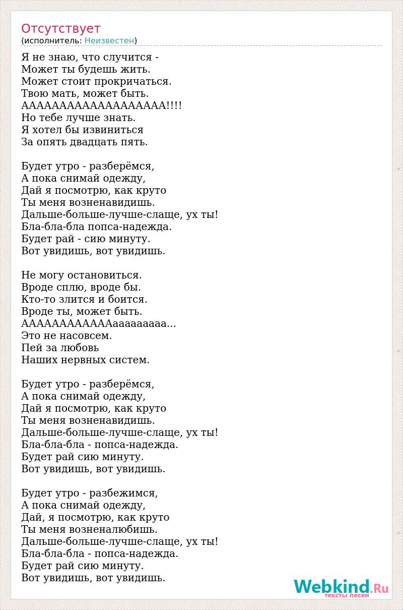 Я не знаю, что случится - Может ты будешь жить. Может стоит прокричаться. Твою мать, может быть. ААААААААААААААААААА!!!! Но тебе лучше знать. Я хотел бы извиниться За опять двадцать пять. Будет утро - разберёмся, А пока снимай одежду, Дай я посмотрю, как круто Ты меня возненавидишь. Дальше-больше-лучше-слаще, ух ты! Бла-бла-бла попса-надежда. Будет рай - сию минуту. Вот увидишь, вот увидишь. Не могу остановиться. Вроде сплю, вроде бы. Кто-то злится и боится. Вроде ты, может быть. ААААААААААААааааааааа... Это не насовсем. Пей за любовь Наших нервных систем. Будет утро - разберёмся, А пока снимай одежду, Дай я посмотрю, как круто Ты меня возненавидишь. Дальше-больше-лучше-слаще, ух ты! Бла-бла-бла - попса-надежда. Будет рай сию минуту. Вот увидишь, вот увидишь. Будет утро - разбежимся, А пока снимай одежду, Дай, я посмотрю, как круто Ты меня возненалюбишь. Дальше-больше-лучше-слаще, ух ты! Бла-бла-бла - попса-надежда. Будет рай сию минуту. Вот увидишь, вот увидишь.