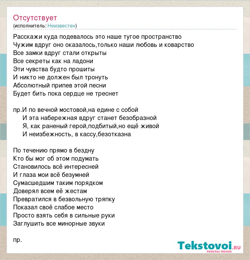 Расскажи куда подевалось это наше тугое пространство Чужим вдруг оно оказалось,только наши любовь и коварство Все замки вдруг стали открыты Все секреты как на ладони Эти чувства будто прошиты И никто не должен был тронуть Абсолютный припев этой песни Будет бить пока сердце не треснет пр.И по вечной мостовой,на едине с собой И эта набережная вдруг станет безобразной Я, как раненый герой,подбитый,но ещё живой И неизбежность, в кассу,безотказна По течению прямо в бездну Кто бы мог об этом подумать Становилось всё интересней И глаза мои всё безумней Сумасшедшим таким порядком Доверял всем её жестам Превратился в безвольную тряпку Показал своё слабое место Просто взять себя в сильные руки Заглушить все минорные звуки пр.