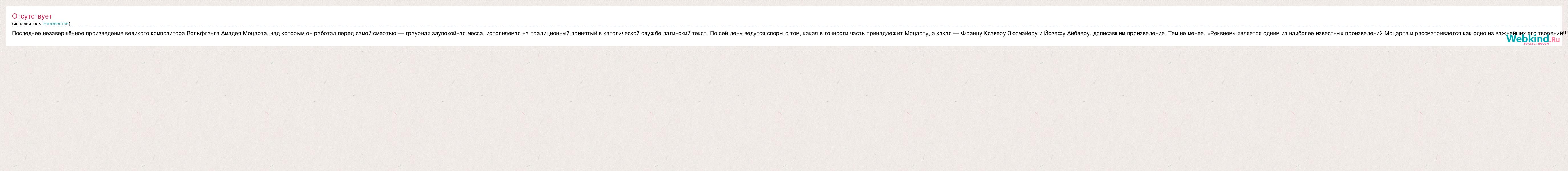 Последнее незавершённое произведение великого композитора Вольфганга Амадея Моцарта, над которым он работал перед самой смертью — траурная заупокойная месса, исполняемая на традиционный принятый в католической службе латинский текст. По сей день ведутся споры о том, какая в точности часть принадлежит Моцарту, а какая — Францу Ксаверу Зюсмайеру и Йозефу Айблеру, дописавшим произведение. Тем не менее, «Реквием» является одним из наиболее известных произведений Моцарта и рассматривается как одно из важнейших его творений!!!
