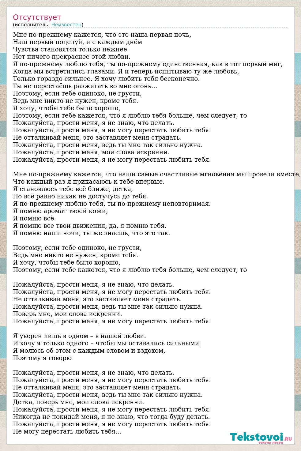 Мне по-прежнему кажется, что это наша первая ночь, Наш первый поцелуй, и с каждым днём Чувства становятся только нежнее. Нет ничего прекраснее этой любви. Я по-прежнему люблю тебя, ты по-прежнему единственная, как в тот первый миг, Когда мы встретились глазами. Я и теперь испытываю ту же любовь, Только гораздо сильнее. Я хочу любить тебя бесконечно. Ты не перестаёшь разжигать во мне огонь… Поэтому, если тебе одиноко, не грусти, Ведь мне никто не нужен, кроме тебя. Я хочу, чтобы тебе было хорошо, Поэтому, если тебе кажется, что я люблю тебя больше, чем следует, то Пожалуйста, прости меня, я не знаю, что делать. Пожалуйста, прости меня, я не могу перестать любить тебя. Не отталкивай меня, это заставляет меня страдать. Пожалуйста, прости меня, ведь ты мне так сильно нужна. Пожалуйста, прости меня, мои слова искренни. Пожалуйста, прости меня, я не могу перестать любить тебя. Мне по-прежнему кажется, что наши самые счастливые мгновения мы провели вместе, Что каждый раз я прикасаюсь к тебе впервые. Я становлюсь тебе всё ближе, детка, Но всё равно никак не достучусь до тебя. Я по-прежнему люблю тебя, ты по-прежнему неповторимая. Я помню аромат твоей кожи, Я помню всё. Я помню все твои движения, да, я помню тебя. Я помню наши ночи, ты же знаешь, что это так. Поэтому, если тебе одиноко, не грусти, Ведь мне никто не нужен, кроме тебя. Я хочу, чтобы тебе было хорошо, Поэтому, если тебе кажется, что я люблю тебя больше, чем следует, то Пожалуйста, прости меня, я не знаю, что делать. Пожалуйста, прости меня, я не могу перестать любить тебя. Не отталкивай меня, это заставляет меня страдать. Пожалуйста, прости меня, ведь ты мне так сильно нужна. Поверь мне, мои слова искренни. Пожалуйста, прости меня, я не могу перестать любить тебя. Я уверен лишь в одном – в нашей любви. И хочу я только одного – чтобы мы оставались сильными, Я молюсь об этом с каждым словом и вздохом, Поэтому я говорю Пожалуйста, прости меня, я не знаю, что делать. Пожалуйста, прости меня, я не могу перестать любить тебя. Не отталкивай меня, это заставляет меня страдать. Пожалуйста, прости меня, ведь ты мне так сильно нужна. Детка, поверь мне, мои слова искренни. Пожалуйста, прости меня, я не могу перестать любить тебя. Никогда не покидай меня, я не знаю, что тогда буду делать. Пожалуйста, прости меня, я не могу перестать любить тебя. Не могу перестать любить тебя...