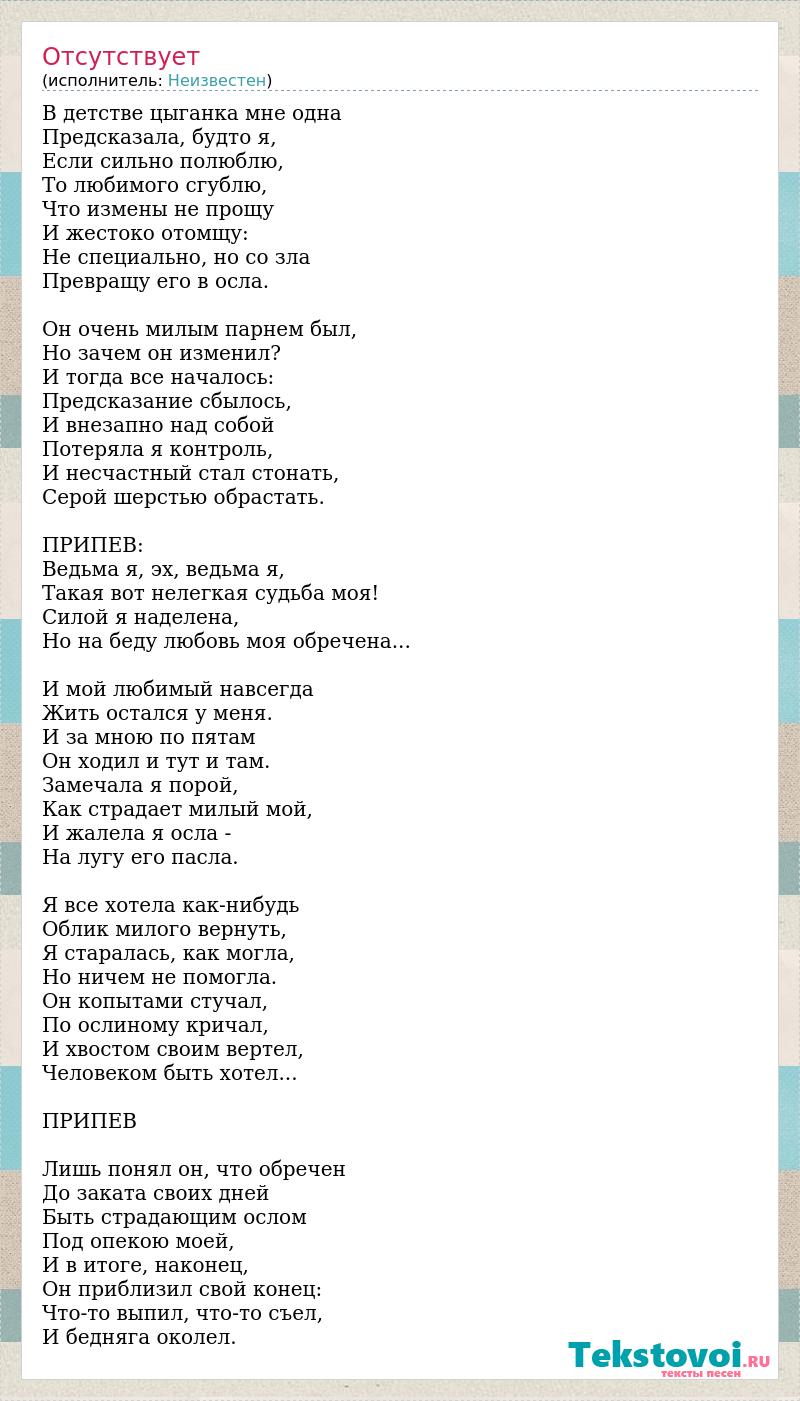 В детстве цыганка мне одна Предсказала, будто я, Если сильно полюблю, То любимого сгублю, Что измены не прощу И жестоко отомщу: Не специально, но со зла Превращу его в осла. Он очень милым парнем был, Но зачем он изменил? И тогда все началось: Предсказание сбылось, И внезапно над собой Потеряла я контроль, И несчастный стал стонать, Серой шерстью обрастать. ПРИПЕВ: Ведьма я, эх, ведьма я, Такая вот нелегкая судьба моя! Силой я наделена, Но на беду любовь моя обречена... И мой любимый навсегда Жить остался у меня. И за мною по пятам Он ходил и тут и там. Замечала я порой, Как страдает милый мой, И жалела я осла - На лугу его пaсла. Я все хотела как-нибудь Облик милого вернуть, Я старалась, как могла, Но ничем не помогла. Он копытами стучал, По ослиному кричал, И хвостом своим вертел, Человеком быть хотел... ПРИПЕВ Лишь понял он, что обречен До заката своих дней Быть страдающим ослом Под опекою моей, И в итоге, наконец, Он приблизил свой конец: Что-то выпил, что-то съел, И бедняга околел.