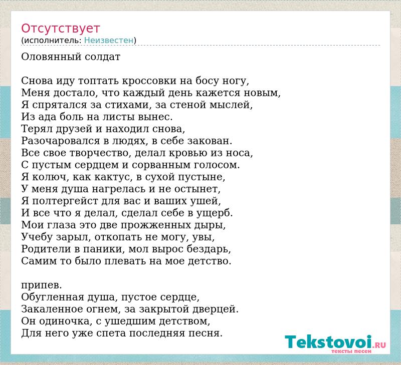 Оловянный солдат Снова иду топтать кроссовки на босу ногу, Меня достало, что каждый день кажется новым, Я спрятался за стихами, за стеной мыслей, Из ада боль на листы вынес. Терял друзей и находил снова, Разочаровался в людях, в себе закован. Все свое творчество, делал кровью из носа, С пустым сердцем и сорванным голосом. Я колюч, как кактус, в сухой пустыне, У меня душа нагрелась и не остынет, Я полтергейст для вас и ваших ушей, И все что я делал, сделал себе в ущерб. Мои глаза это две прожженных дыры, Учебу зарыл, откопать не могу, увы, Родители в паники, мол вырос бездарь, Самим то было плевать на мое детство. припев. Обугленная душа, пустое сердце, Закаленное огнем, за закрытой дверцей. Он одиночка, с ушедшим детством, Для него уже спета последняя песня.
