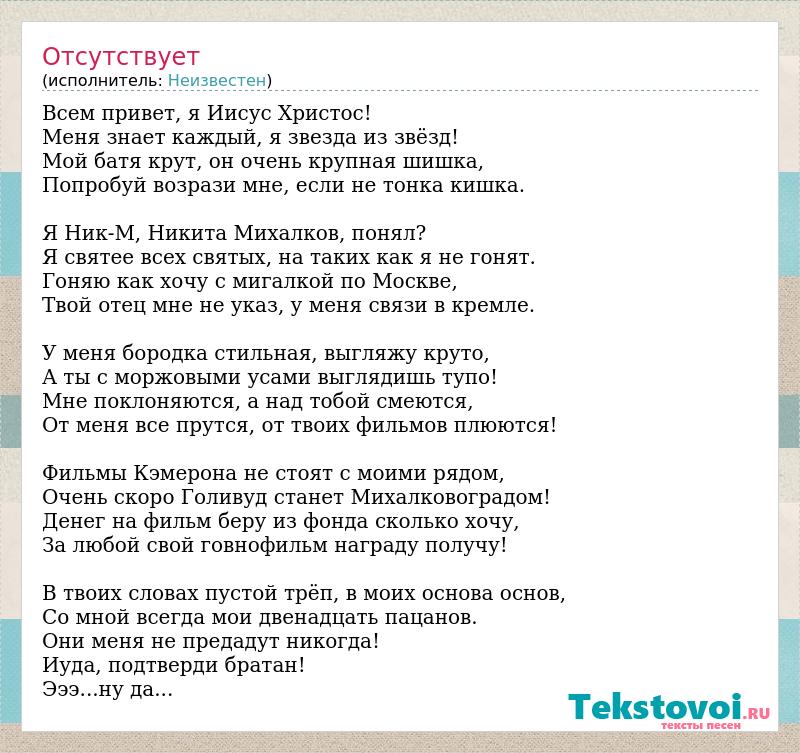 Всем привет, я Иисус Христос! Меня знает каждый, я звезда из звёзд! Мой батя крут, он очень крупная шишка, Попробуй возрази мне, если не тонка кишка. Я Ник-М, Никита Михалков, понял? Я святее всех святых, на таких как я не гонят. Гоняю как хочу с мигалкой по Москве, Твой отец мне не указ, у меня связи в кремле. У меня бородка стильная, выгляжу круто, А ты с моржовыми усами выглядишь тупо! Мне поклоняются, а над тобой смеются, От меня все прутся, от твоих фильмов плюются! Фильмы Кэмерона не стоят с моими рядом, Очень скоро Голивуд станет Михалковоградом! Денег на фильм беру из фонда сколько хочу, За любой свой говнофильм награду получу! В твоих словах пустой трёп, в моих основа основ, Со мной всегда мои двенадцать пацанов. Они меня не предадут никогда! Иуда, подтверди братан! Эээ...ну да...