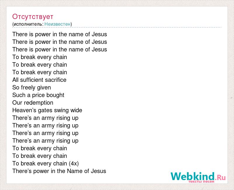 There is power in the name of Jesus There is power in the name of Jesus There is power in the name of Jesus To break every chain To break every chain To break every chain All sufficient sacrifice So freely given Such a price bought Our redemption Heaven’s gates swing wide There’s an army rising up There’s an army rising up There’s an army rising up There’s an army rising up To break every chain To break every chain To break every chain (4x) There’s power in the Name of Jesus