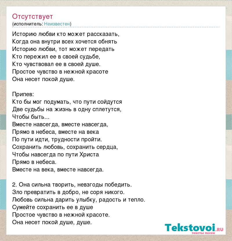 Историю любви кто может рассказать, Когда она внутри всех хочется обнять Историю любви, тот может передать Кто пережил ее в своей судьбе, Кто чувствовал ее в своей душе. Простое чувство в нежной красоте Она несет покой душе. Припев: Кто бы мог подумать, что пути сойдутся Две судьбы на жизнь в одну сплетутся, Чтобы быть... Вместе навсегда, вместе навсегда, Прямо в небеса, вместе на века По пути идти, трудности пройти. Сохранить любовь, сохранить сердца, Чтобы навсегда по пути Христа Прямо в небеса. Вместе на века, вместе навсегда. 2. Она сильна творить, невзгоды победить. Зло превратить в добро, не соря никого. Любовь сильна дарить улыбку, радость и тепло. Сумейте сохранить ее в душе Простое чувство в нежной красоте. Она несет покой душе, душе.