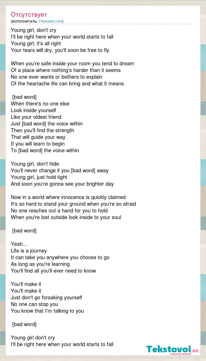 Young girl, don't cry I'll be right here when your world starts to fall Young girl, it's all right Your tears will dry, you'll soon be free to fly When you're safe inside your room you tend to dream Of a place where nothing's harder than it seems No one ever wants or bothers to explain Of the heartache life can bring and what it means [bad word] When there's no one else Look inside yourself Like your oldest friend Just [bad word] the voice within Then you'll find the strength That will guide your way If you will learn to begin To [bad word] the voice within Young girl, don't hide You'll never change if you [bad word] away Young girl, just hold tight And soon you're gonna see your brighter day Now in a world where innocence is quickly claimed It's so hard to stand your ground when you're so afraid No one reaches out a hand for you to hold When you're lost outside look inside to your soul [bad word] Yeah... Life is a journey It can take you anywhere you choose to go As long as you're learning You'll find all you'll ever need to know You'll make it You'll make it Just don't go forsaking yourself No one can stop you You know that I'm talking to you [bad word] Young girl don't cry I'll be right here when your world starts to fall
