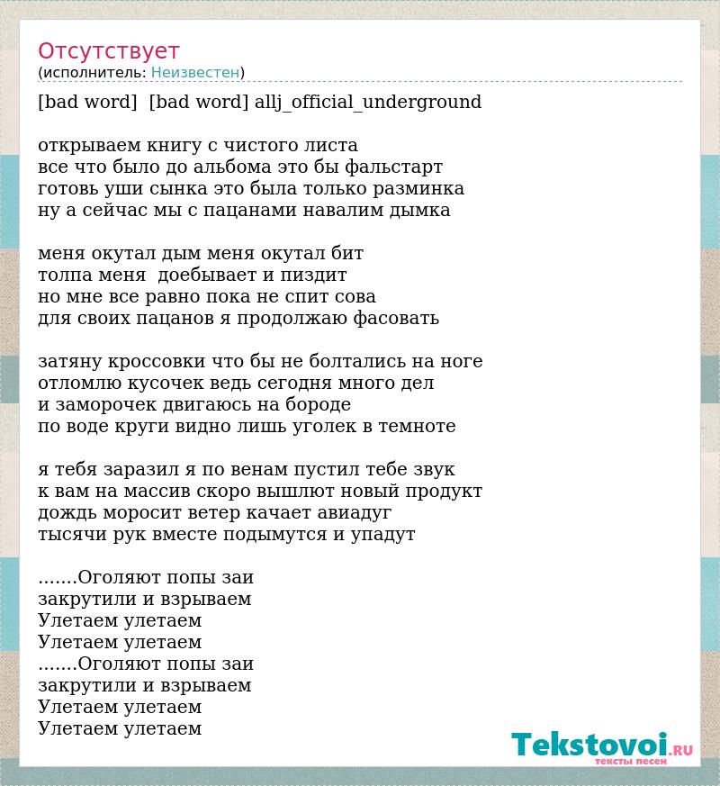 [bad word] [bad word] allj_official_underground открываем книгу с чистого листа все что было до альбома это бы фальстарт готовь уши сынка это была только разминка ну а сейчас мы с пацанами навалим дымка меня окутал дым меня окутал бит толпа меня доебывает и пиздит но мне все равно пока не спит сова для своих пацанов я продолжаю фасовать затяну кроссовки что бы не болтались на ноге отломлю кусочек ведь сегодня много дел и заморочек двигаюсь на бороде по воде круги видно лишь уголек в темноте я тебя заразил я по венам пустил тебе звук к вам на массив скоро вышлют новый продукт дождь моросит ветер качает авиадуг тысячи рук вместе подымутся и упадут .......Оголяют попы заи закрутили и взрываем Улетаем улетаем Улетаем улетаем .......Оголяют попы заи закрутили и взрываем Улетаем улетаем Улетаем улетаем