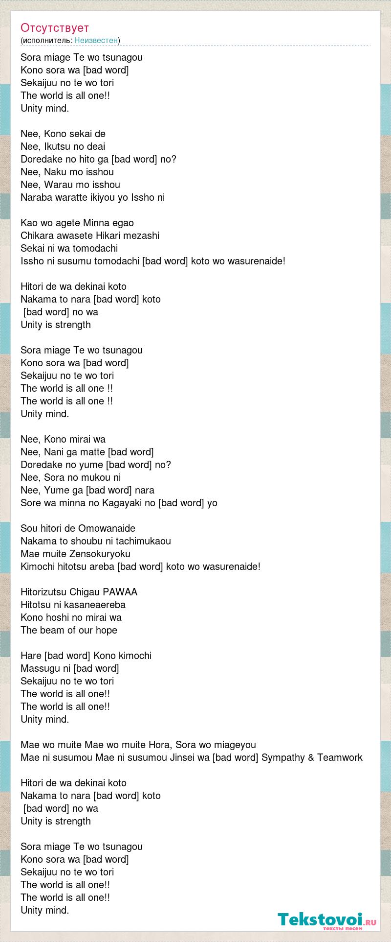 Sora miage Te wo tsunagou Kono sora wa [bad word] Sekaijuu no te wo tori The world is all one!! Unity mind. Nee, Kono sekai de Nee, Ikutsu no deai Doredake no hito ga [bad word] no? Nee, Naku mo isshou Nee, Warau mo isshou Naraba waratte ikiyou yo Issho ni Kao wo agete Minna egao Chikara awasete Hikari mezashi Sekai ni wa tomodachi Issho ni susumu tomodachi [bad word] koto wo wasurenaide! Hitori de wa dekinai koto Nakama to nara [bad word] koto [bad word] no wa Unity is strength Sora miage Te wo tsunagou Kono sora wa [bad word] Sekaijuu no te wo tori The world is all one !! The world is all one !! Unity mind. Nee, Kono mirai wa Nee, Nani ga matte [bad word] Doredake no yume [bad word] no? Nee, Sora no mukou ni Nee, Yume ga [bad word] nara Sore wa minna no Kagayaki no [bad word] yo Sou hitori de Omowanaide Nakama to shoubu ni tachimukaou Mae muite Zensokuryoku Kimochi hitotsu areba [bad word] koto wo wasurenaide! Hitorizutsu Chigau PAWAA Hitotsu ni kasaneaereba Kono hoshi no mirai wa The beam of our hope Hare [bad word] Kono kimochi Massugu ni [bad word] Sekaijuu no te wo tori The world is all one!! The world is all one!! Unity mind. Mae wo muite Mae wo muite Hora, Sora wo miageyou Mae ni susumou Mae ni susumou Jinsei wa [bad word] Sympathy & Teamwork Hitori de wa dekinai koto Nakama to nara [bad word] koto [bad word] no wa Unity is strength Sora miage Te wo tsunagou Kono sora wa [bad word] Sekaijuu no te wo tori The world is all one!! The world is all one!! Unity mind.