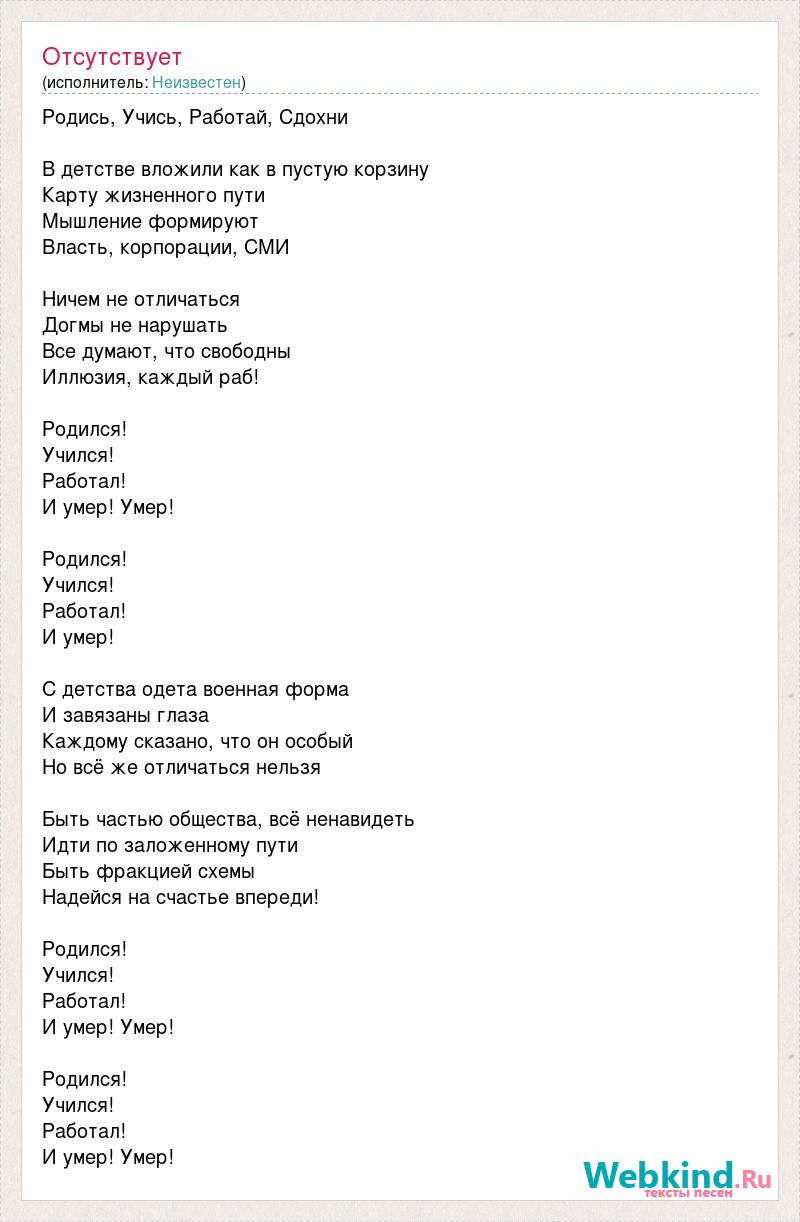 Родись, Учись, Работай, Сдохни В детстве вложили как в пустую корзину Карту жизненного пути Мышление формируют Власть, корпорации, СМИ Ничем не отличаться Догмы не нарушать Все думают, что свободны Иллюзия, каждый раб! Родился! Учился! Работал! И умер! Умер! Родился! Учился! Работал! И умер! С детства одета военная форма И завязаны глаза Каждому сказано, что он особый Но всё же отличаться нельзя Быть частью общества, всё ненавидеть Идти по заложенному пути Быть фракцией схемы Надейся на счастье впереди! Родился! Учился! Работал! И умер! Умер! Родился! Учился! Работал! И умер! Умер!