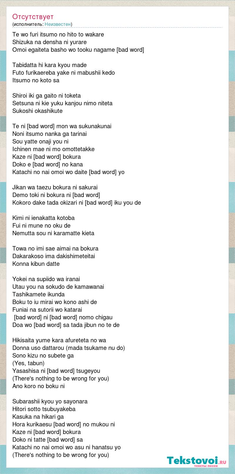 Te wo furi itsumo no hito to wakare Shizuka na densha ni yurare Omoi egaiteta basho wo tooku nagame [bad word] Tabidatta hi kara kyou made Futo furikaereba yake ni mabushii kedo Itsumo no koto sa Shiroi iki ga gaito ni toketa Setsuna ni kie yuku kanjou nimo niteta Sukoshi okashikute Te ni [bad word] mon wa sukunakunai Noni itsumo nanka ga tarinai Sou yatte onaji you ni Ichinen mae ni mo omottetakke Kaze ni [bad word] bokura Doko e [bad word] no kana Katachi no nai omoi wo daite [bad word] yo Jikan wa taezu bokura ni sakurai Demo toki ni bokura ni [bad word] Kokoro dake tada okizari ni [bad word] iku you de Kimi ni ienakatta kotoba Fui ni mune no oku de Nemutta sou ni karamatte kieta Towa no imi sae aimai na bokura Dakarakoso ima dakishimeteitai Konna kibun datte Yokei na supiido wa iranai Utau you na sokudo de kamawanai Tashikamete ikunda Boku to iu mirai wo kono ashi de Funiai na sutorii wo katarai [bad word] ni [bad word] nomo chigau Doa wo [bad word] sa tada jibun no te de Hikisaita yume kara afureteta no wa Donna uso dattarou (mada tsukame nu do) Sono kizu no subete ga (Yes, tabun) Yasashisa ni [bad word] tsugeyou (There's nothing to be wrong for you) Ano koro no boku ni Subarashii kyou yo sayonara Hitori sotto tsubuyakeba Kasuka na hikari ga Hora kurikaesu [bad word] no mukou ni Kaze ni [bad word] bokura Doko ni tatte [bad word] sa Katachi no nai omoi wo asu ni hanatsu yo (There's nothing to be wrong for you)
