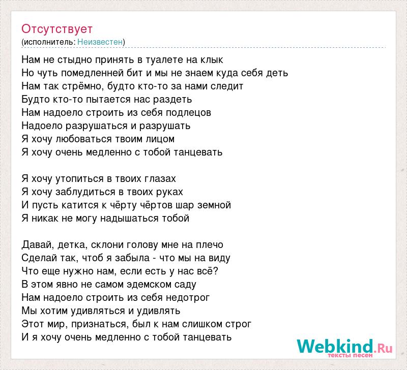 Нам не стыдно принять в туалете на клык Но чуть помедленней бит и мы не знаем куда себя деть Нам так стрёмно, будто кто-то за нами следит Будто кто-то пытается нас раздеть Нам надоело строить из себя подлецов Надоело разрушаться и разрушать Я хочу любоваться твоим лицом Я хочу очень медленно с тобой танцевать Я хочу утопиться в твоих глазах Я хочу заблудиться в твоих руках И пусть катится к чёрту чёртов шар земной Я никак не могу надышаться тобой Давай, детка, склони голову мне на плечо Сделай так, чтоб я забыла - что мы на виду Что еще нужно нам, если есть у нас всё? В этом явно не самом эдемском саду Нам надоело строить из себя недотрог Мы хотим удивляться и удивлять Этот мир, признаться, был к нам слишком строг И я хочу очень медленно с тобой танцевать