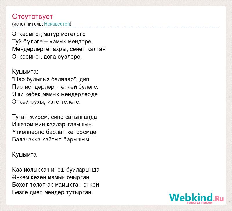 Әнкәемнең матур истәлеге Туй бүләге – мамык мендәре. Мендәрләргә, ахры, сеңеп калган Әнкәемнең дога сүзләре. Кушымта: “Пар булыгыз балалар”, дип Пар мендәрләр – әнкәй буләге. Яши кебек мамык мендәрләрдә Әнкәй рухы, изге теләге. Туган җирем, сине сагынганда Ишетәм мин казлар тавышын. Үткәннәрне барлап хәтеремдә, Балачакка кайтып барышым. Кушымта Каз йолыккач инеш буйларында Әнкәм көзен мамык очырган. Бәхет теләп ак мамыктан әнкәй Безгә диеп мендәр тутырган.