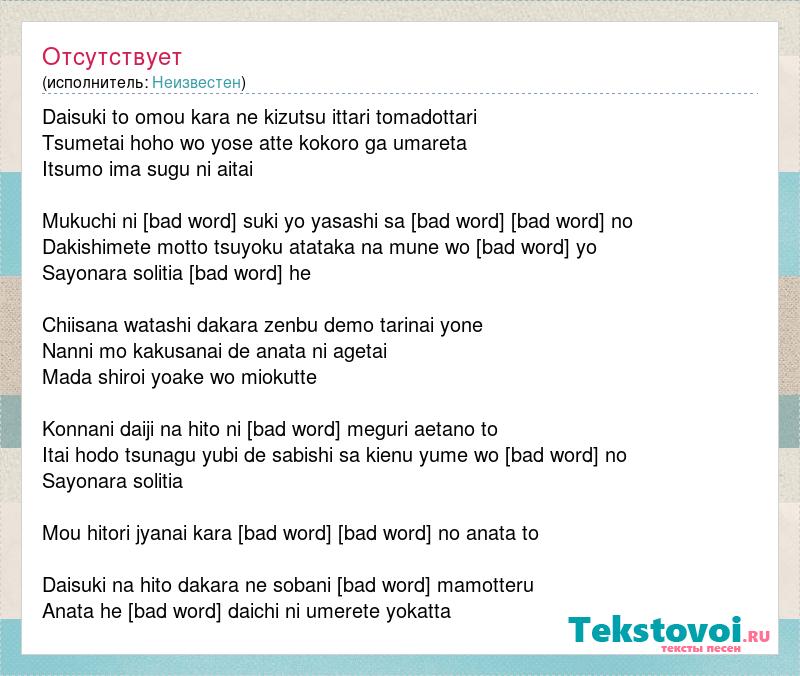 Daisuki to omou kara ne kizutsu ittari tomadottari Tsumetai hoho wo yose atte kokoro ga umareta Itsumo ima sugu ni aitai Mukuchi ni [bad word] suki yo yasashi sa [bad word] [bad word] no Dakishimete motto tsuyoku atataka na mune wo [bad word] yo Sayonara solitia [bad word] he Chiisana watashi dakara zenbu demo tarinai yone Nanni mo kakusanai de anata ni agetai Mada shiroi yoake wo miokutte Konnani daiji na hito ni [bad word] meguri aetano to Itai hodo tsunagu yubi de sabishi sa kienu yume wo [bad word] no Sayonara solitia Mou hitori jyanai kara [bad word] [bad word] no anata to Daisuki na hito dakara ne sobani [bad word] mamotteru Anata he [bad word] daichi ni umerete yokatta