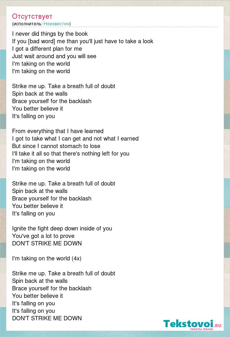 I never did things by the book If you [bad word] me than you'll just have to take a look I got a different plan for me Just wait around and you will see I'm taking on the world I'm taking on the world Strike me up. Take a breath full of doubt Spin back at the walls Brace yourself for the backlash You better believe it It's falling on you From everything that I have learned I got to take what I can get and not what I earned But since I cannot stomach to lose I'll take it all so that there's nothing left for you I'm taking on the world I'm taking on the world Strike me up. Take a breath full of doubt Spin back at the walls Brace yourself for the backlash You better believe it It's falling on you Ignite the fight deep down inside of you You've got a lot to prove DON'T STRIKE ME DOWN I'm taking on the world (4x) Strike me up. Take a breath full of doubt Spin back at the walls Brace yourself for the backlash You better believe it It's falling on you It's falling on you DON'T STRIKE ME DOWN