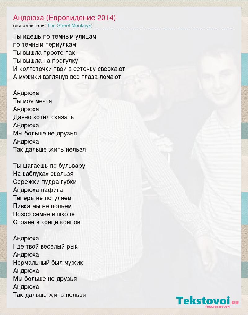 Ты идешь по темным улицам по темным периулкам Ты вышла просто так Ты вышла на прогулку И колготочки твои в сеточку сверкают А мужики взглянув все глаза ломают Андрюха Ты моя мечта Андрюха Давно хотел сказать Андрюха Мы больше не друзья Андрюха Так дальше жить нельзя Ты шагаешь по бульвару На каблуках скользя Сережки пудра губки Андрюха нафига Теперь не погуляем Пивка мы не попьем Позор семье и школе Стране в конце концов Андрюха Где твой веселый рык Андрюха Нормальный был мужик Андрюха Мы больше не друзья Андрюха Так дальше жить нельзя