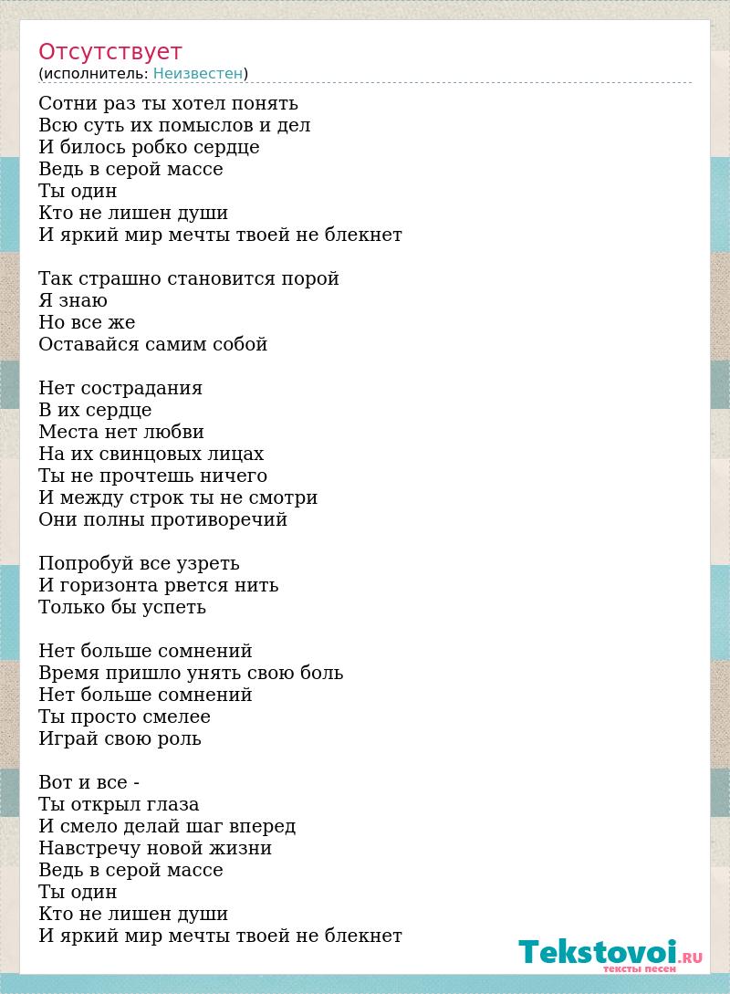 Сотни раз ты хотел понять Всю суть их помыслов и дел И билось робко сердце Ведь в серой массе Ты один Кто не лишен души И яркий мир мечты твоей не блекнет Так страшно становится порой Я знаю Но все же Оставайся самим собой Нет сострадания В их сердце Места нет любви На их свинцовых лицах Ты не прочтешь ничего И между строк ты не смотри Они полны противоречий Попробуй все узреть И горизонта рвется нить Только бы успеть Нет больше сомнений Время пришло унять свою боль Нет больше сомнений Ты просто смелее Играй свою роль Вот и все - Ты открыл глаза И смело делай шаг вперед Навстречу новой жизни Ведь в серой массе Ты один Кто не лишен души И яркий мир мечты твоей не блекнет