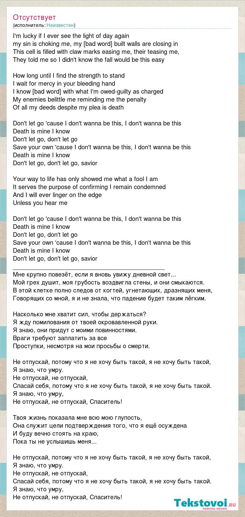 I'm lucky if I ever see the light of day again my sin is choking me, my [bad word] built walls are closing in This cell is filled with claw marks easing me, their teasing me, They told me so I didn't know the fall would be this easy How long until I find the strength to stand I wait for mercy in your bleeding hand I know [bad word] with what I'm owed-guilty as charged My enemies belittle me reminding me the penalty Of all my deeds despite my plea is death Don't let go 'cause I don't wanna be this, I don't wanna be this Death is mine I know Don't let go, don't let go Save your own 'cause I don't wanna be this, I don't wanna be this Death is mine I know Don't let go, don't let go, savior Your way to life has only showed me what a fool I am It serves the purpose of confirming I remain condemned And I will ever linger on the edge Unless you hear me Don't let go 'cause I don't wanna be this, I don't wanna be this Death is mine I know Don't let go, don't let go Save your own 'cause I don't wanna be this, I don't wanna be this Death is mine I know Don't let go, don't let go, savior _____________________________________________ Мне крупно повезёт, если я вновь увижу дневной свет... Мой грех душит, моя грубость воздвигла стены, и они смыкаются. В этой клетке полно следов от когтей, угнетающих, дразнящих меня, Говорящих со мной, я и не знала, что падение будет таким лёгким. Насколько мне хватит сил, чтобы держаться? Я жду помилования от твоей окровавленной руки. Я знаю, они придут с моими повинностями. Враги требуют заплатить за все Проступки, несмотря на мои просьбы о смерти. Не отпускай, потому что я не хочу быть такой, я не хочу быть такой, Я знаю, что умру. Не отпускай, не отпускай, Спасай себя, потому что я не хочу быть такой, я не хочу быть такой. Я знаю, что умру, Не отпускай, не отпускай, Спаситель! Твоя жизнь показала мне всю мою глупость, Она служит цели подтверждения того, что я ещё осуждена И буду вечно стоять на краю, Пока ты не услышишь меня... Не отпускай, потому что я не хочу быть такой, я не хочу быть такой, Я знаю, что умру. Не отпускай, не отпускай, Спасай себя, потому что я не хочу быть такой, я не хочу быть такой. Я знаю, что умру, Не отпускай, не отпускай, Спаситель!