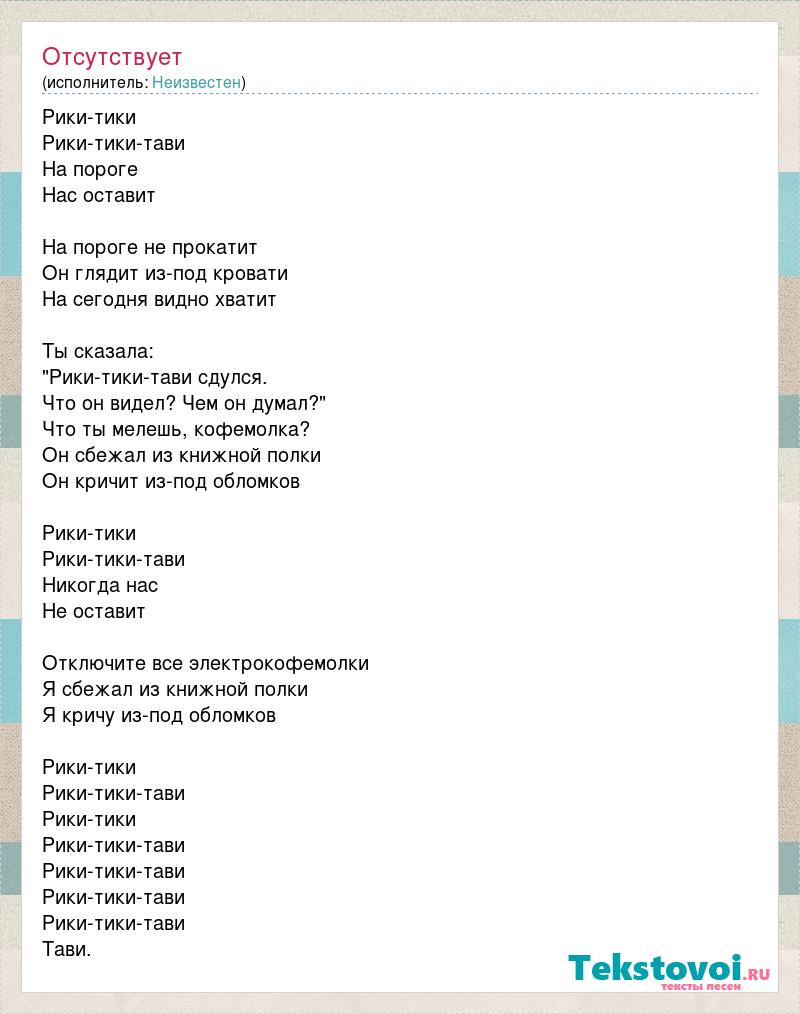 Рики-тики Рики-тики-тави На пороге Нас оставит На пороге не прокатит Он глядит из-под кровати На сегодня видно хватит Ты сказала: "Рики-тики-тави сдулся. Что он видел? Чем он думал?" Что ты мелешь, кофемолка? Он сбежал из книжной полки Он кричит из-под обломков Рики-тики Рики-тики-тави Никогда нас Не оставит Отключите все электрокофемолки Я сбежал из книжной полки Я кричу из-под обломков Рики-тики Рики-тики-тави Рики-тики Рики-тики-тави Рики-тики-тави Рики-тики-тави Рики-тики-тави Тави.