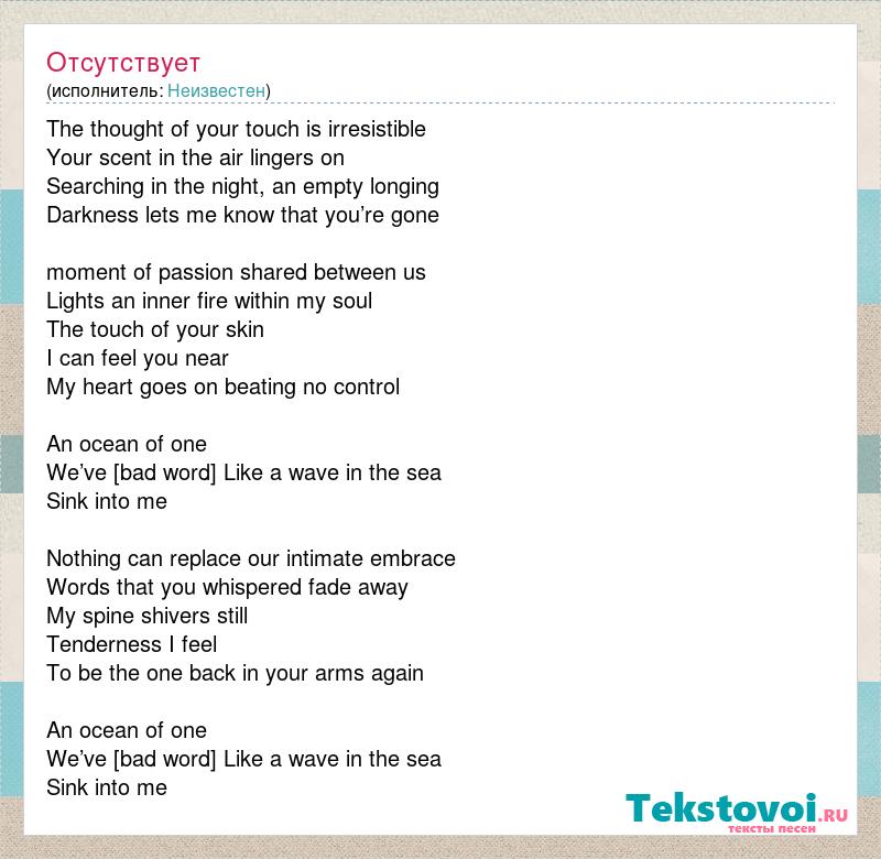 The thought of your touch is irresistible Your scent in the air lingers on Searching in the night, an empty longing Darkness lets me know that you’re gone moment of passion shared between us Lights an inner fire within my soul The touch of your skin I can feel you near My heart goes on beating no control An ocean of one We’ve [bad word] Like a wave in the sea Sink into me Nothing can replace our intimate embrace Words that you whispered fade away My spine shivers still Tenderness I feel To be the one back in your arms again An ocean of one We’ve [bad word] Like a wave in the sea Sink into me