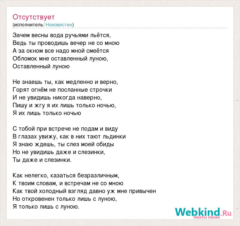Зачем весны вода ручьями льётся, Ведь ты проводишь вечер не со мною А за окном все надо мной смеётся Обломок мне оставленный луною, Оставленный луною Не знаешь ты, как медленно и верно, Горят огнём не посланные строчки И не увидишь никогда наверно, Пишу и жгу я их лишь только ночью, Я их лишь только ночью С тобой при встрече не подам и виду В глазах увижу, как в них тают льдинки Я знаю ждешь, ты слез моей обиды Но не увидишь даже и слезинки, Ты даже и слезинки. Как нелегко, казаться безразличным, К твоим словам, и встречам не со мною Как твой холодный взгляд давно уж мне привычен Но откровенен только лишь с луною, Я только лишь с луною.