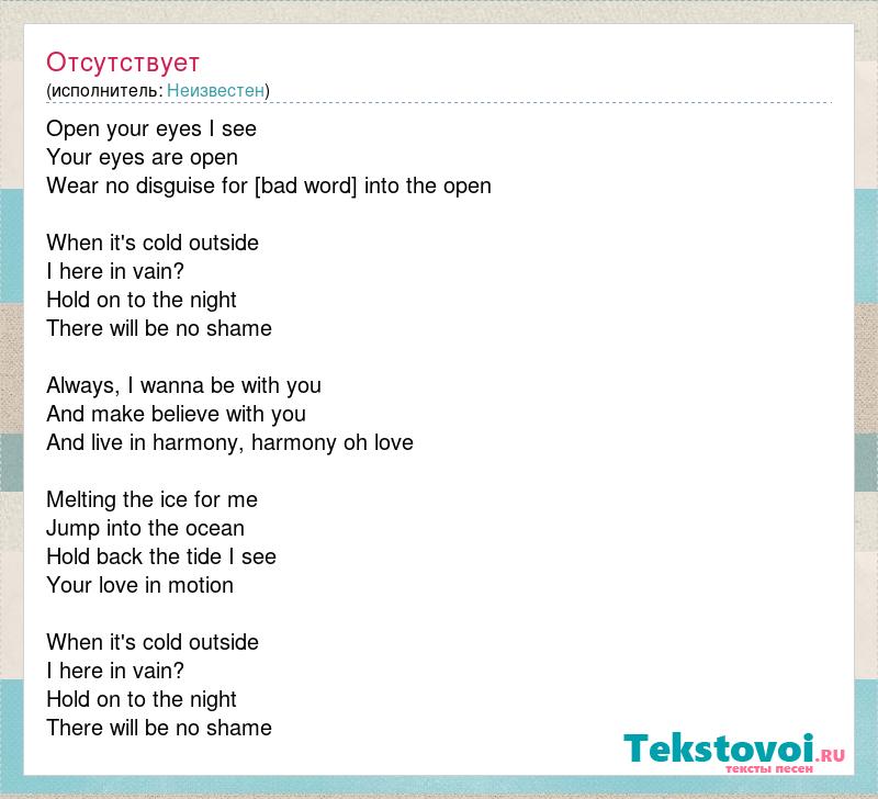Open your eyes I see Your eyes are open Wear no disguise for [bad word] into the open When it's cold outside I here in vain? Hold on to the night There will be no shame Always, I wanna be with you And make believe with you And live in harmony, harmony oh love Melting the ice for me Jump into the ocean Hold back the tide I see Your love in motion When it's cold outside I here in vain? Hold on to the night There will be no shame